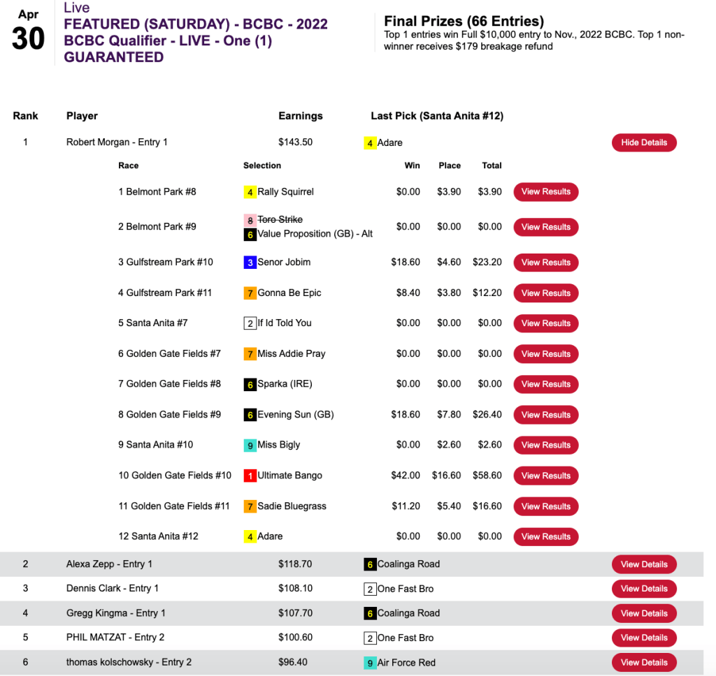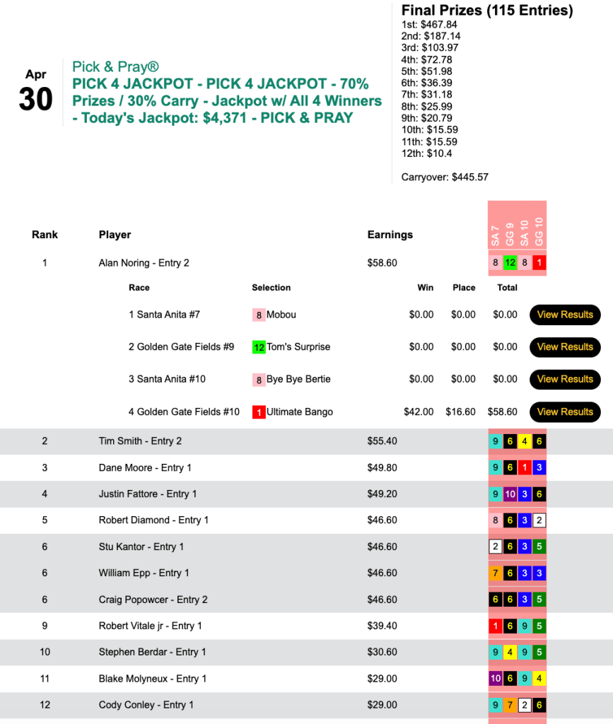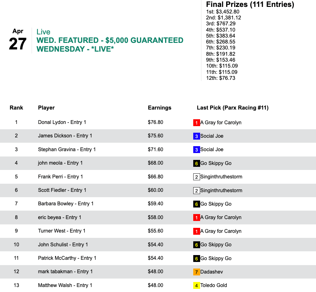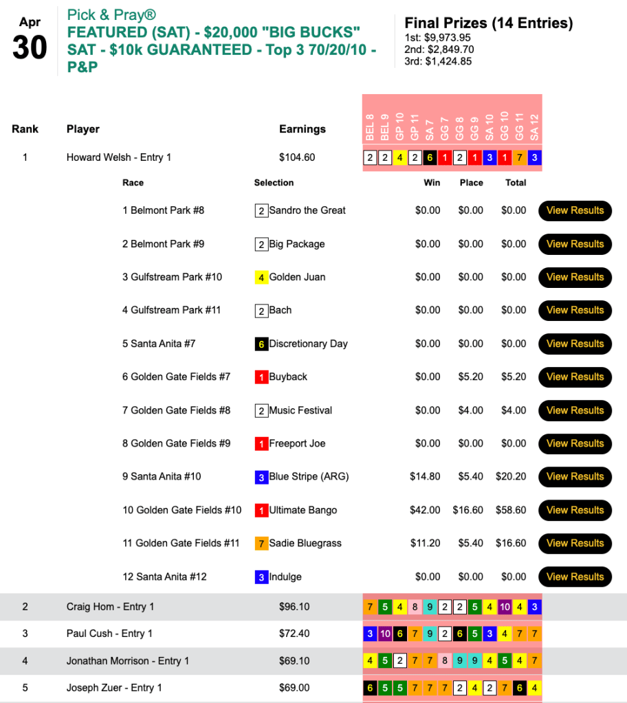 Welsh whiffed on the first 5 races, but racked up 3 wins and 2 places over the final 7 to pick up $9,973 in Saturday’s $10,000 Guaranteed Big Bucks Pick & Pray, which wound up with a final pot of $14,248.