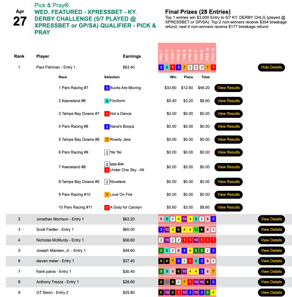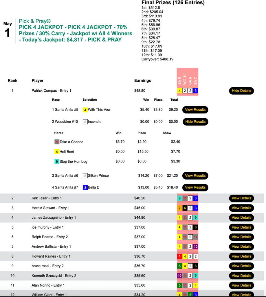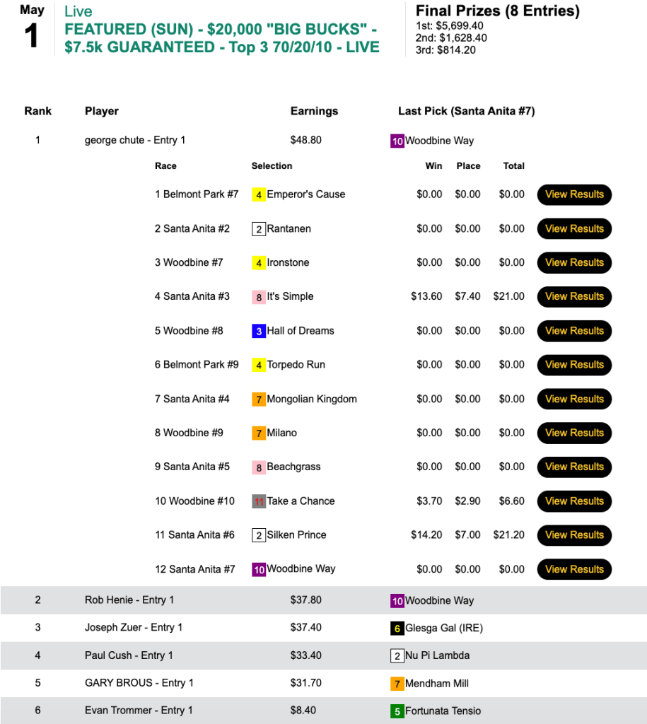 Welsh whiffed on the first 5 races, but racked up 3 wins and 2 places over the final 7 to pick up $9,973 in Saturday’s $10,000 Guaranteed Big Bucks Pick & Pray, which wound up with a final pot of $14,248.