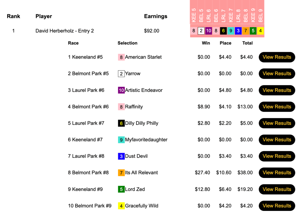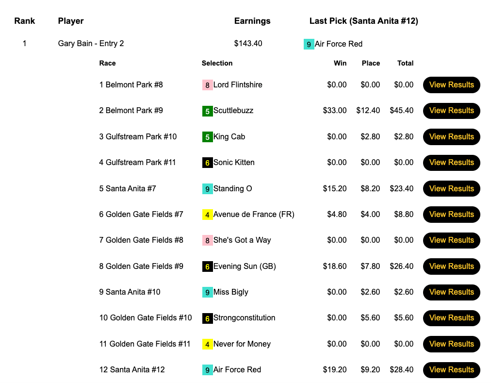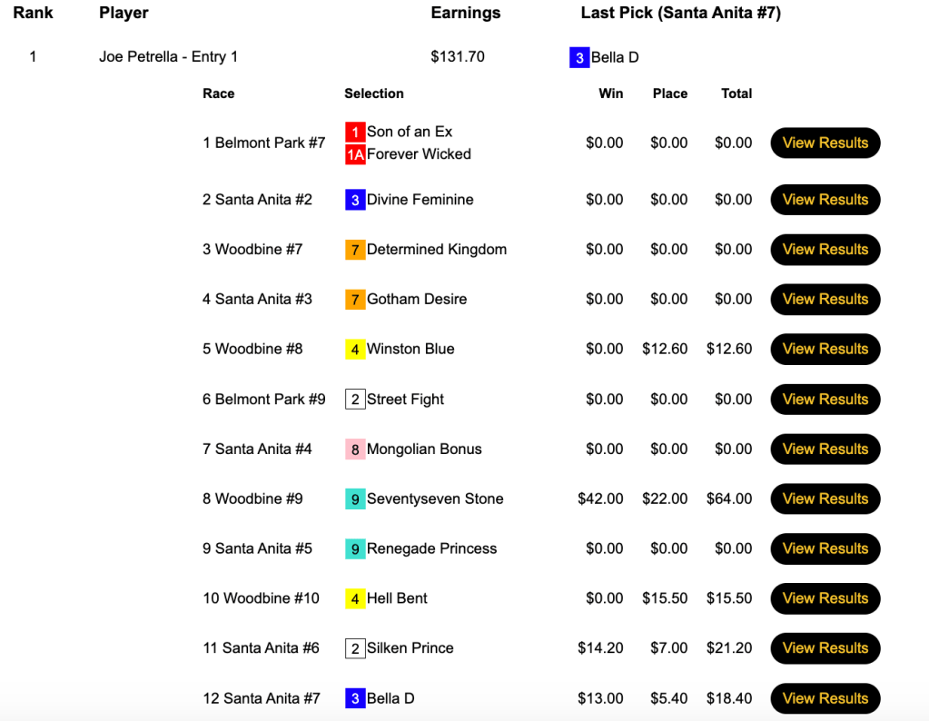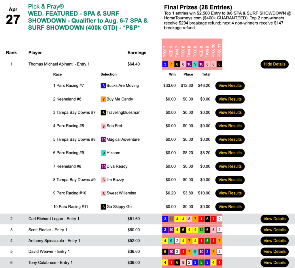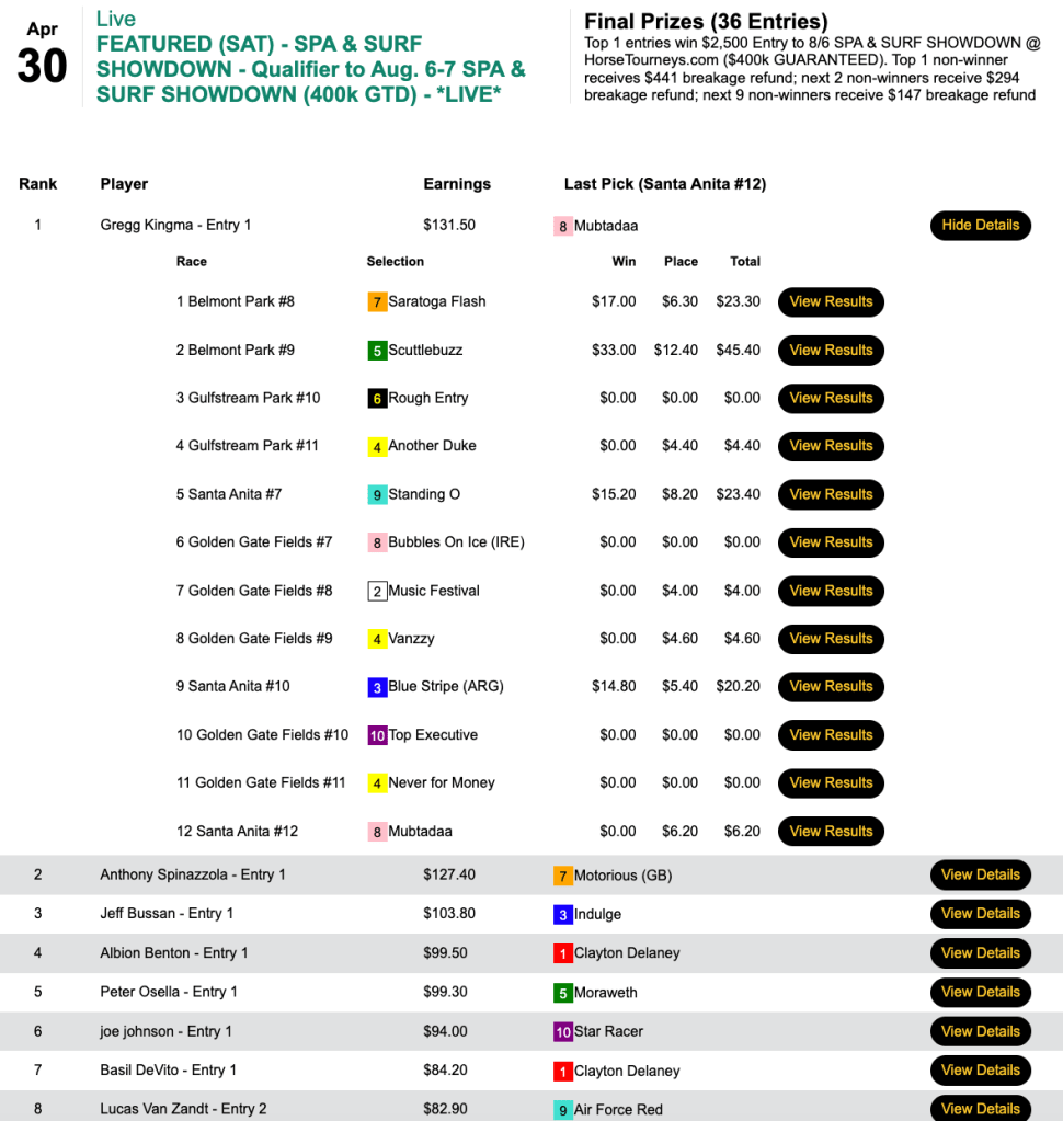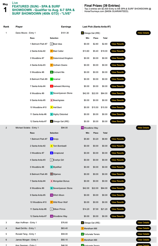 Moore played the same horses in the Live-format Spa & Surf Showdown play-in that he did in the Pick & Prays, and the result was the same…he won. Finishing second but also winning—a $2,500 seat to the $400,000 Guaranteed Showdown—was Michael Solakis (3 wins, 0 places). Solakis also used Woodbine bomb Seventyseven Stone.
