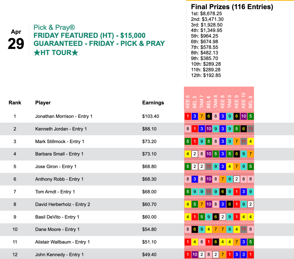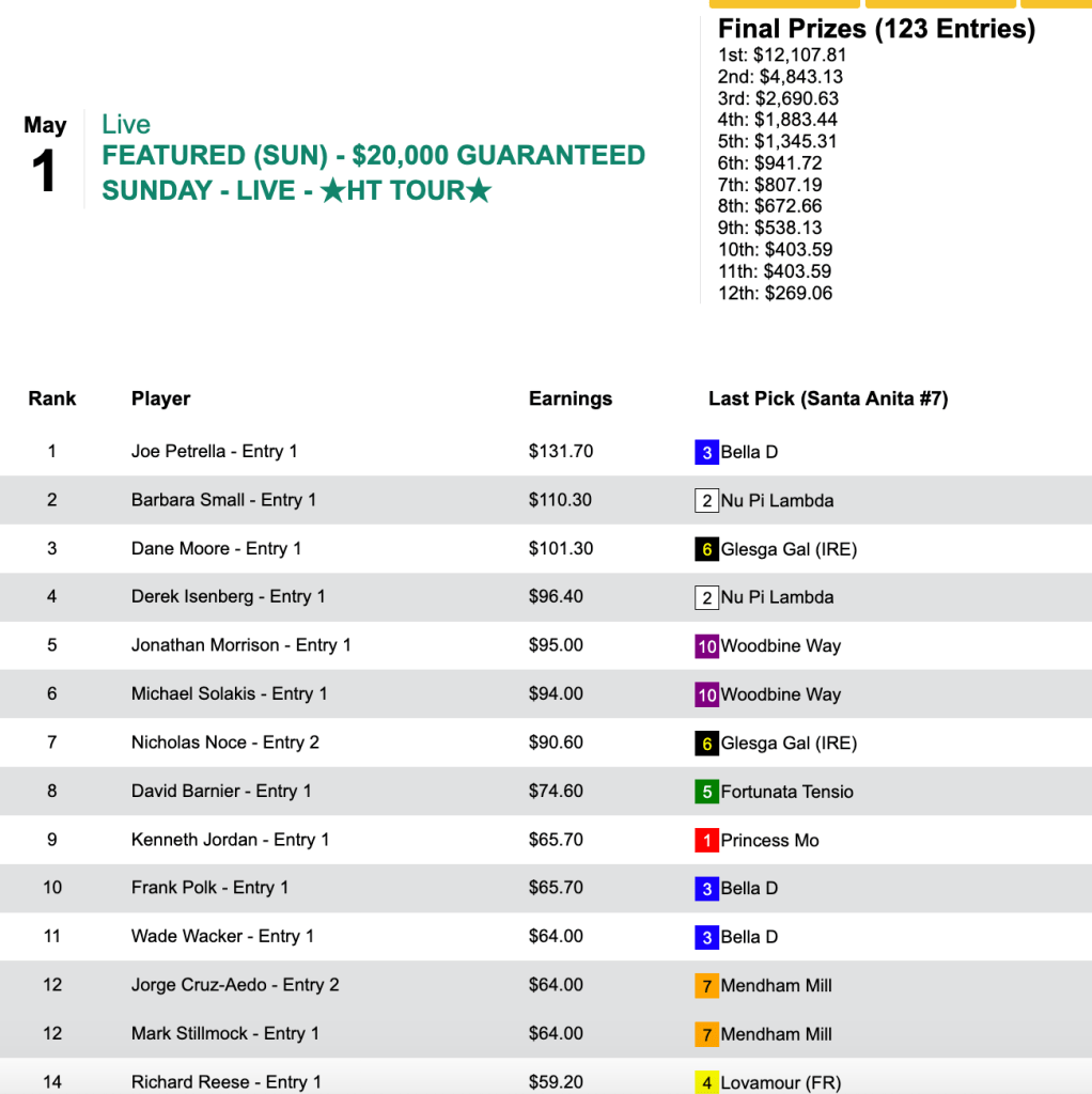 It came in Sunday’s HT Tour event, our $20,000 Guaranteed game, where Petrella finished with 3 wins and 2 places after collecting in each of the final three races. Petrella earned $12,107 from a prize pool that closed at $26,906. You didn’t have to drill down too far to find Moore’s name again, though. He finished third here to pocket $2,690…which should cover his many entry fees and then some. Quite a day!