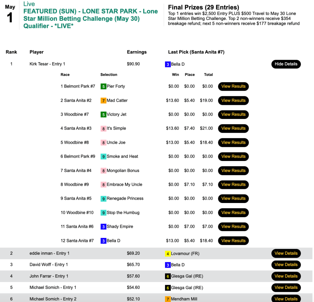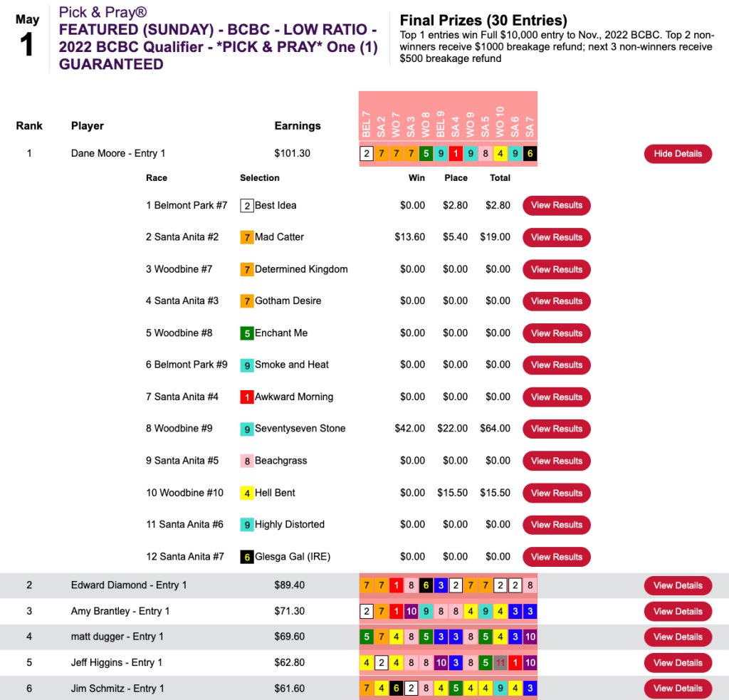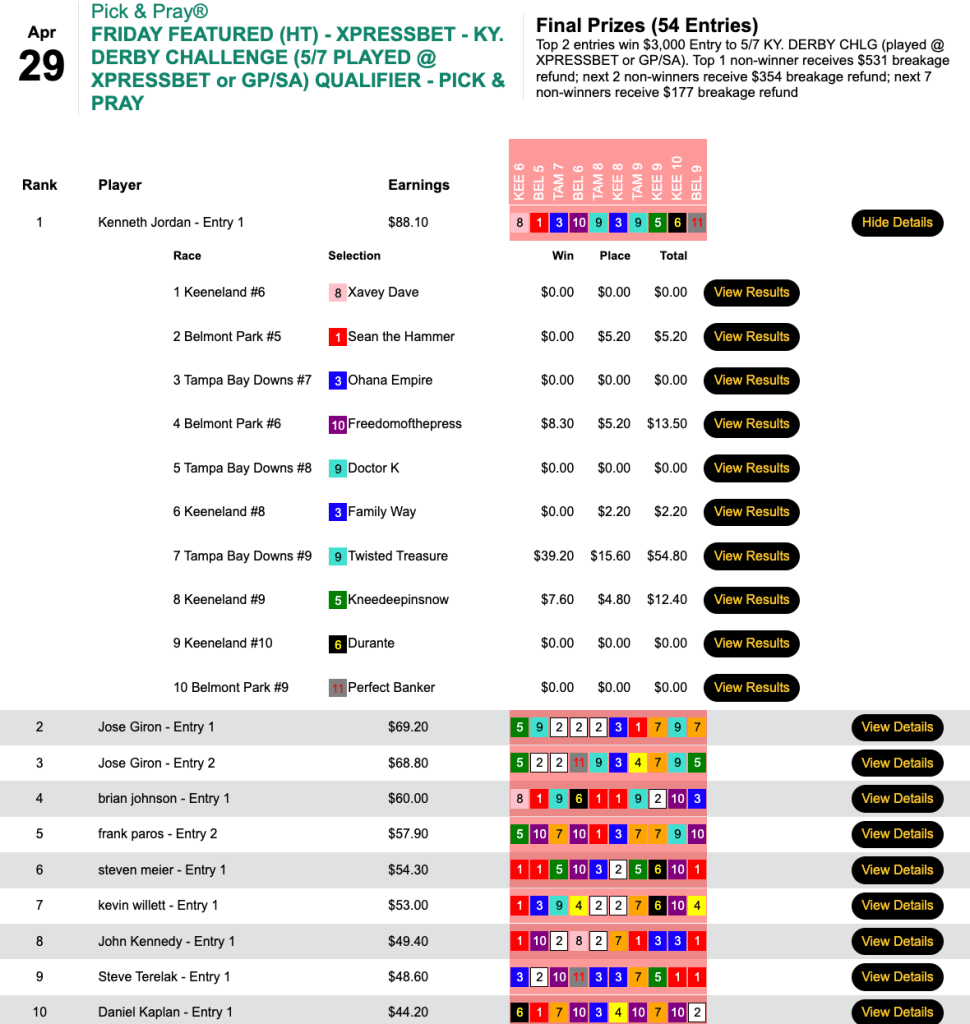 The Kentucky Derby Challenge and BCBC qualifiers were two of the rare Pick & Prays offered on Sunday. Most of the features were run in Live format. But when you are feeling good about your picks, why get too clever?