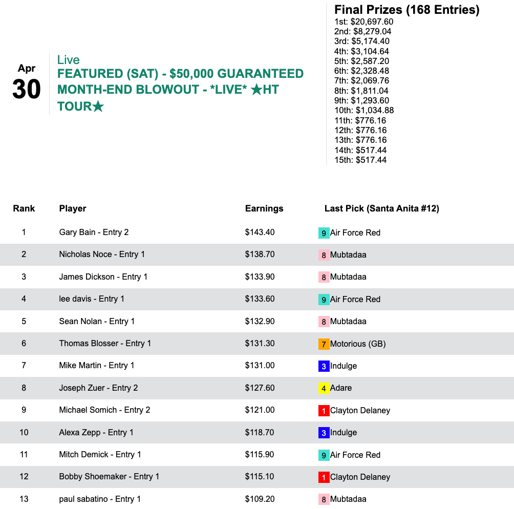He had 5 firsts and 3 seconds to earn $20,697 in Saturday’s $50,000 Month-End Blowout, which also served as the day’s HT Tour game. Final purse for this one amounted to $51,744.