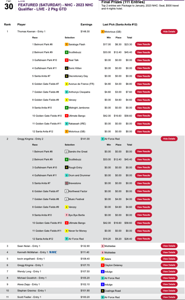 They each had Ultimate Bango ($47.80, $16.60) in the 10th at Golden Gate on the way to NHC berths in Saturday’s $165 qualifier at HP. Keenan’s score of $148.30 was the day’s best—and Kingma’s NHC seat was not his only grand prize of the day.