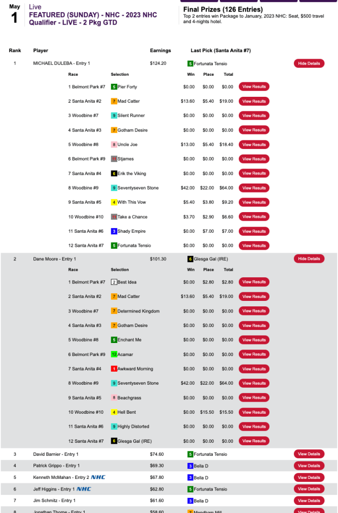 Moore also took a swing with his “written-in-stone” selections in Sunday’s Live-format NHC qualifier at HorsePlayers. He didn’t finish first here, but the result for him was just as happy.