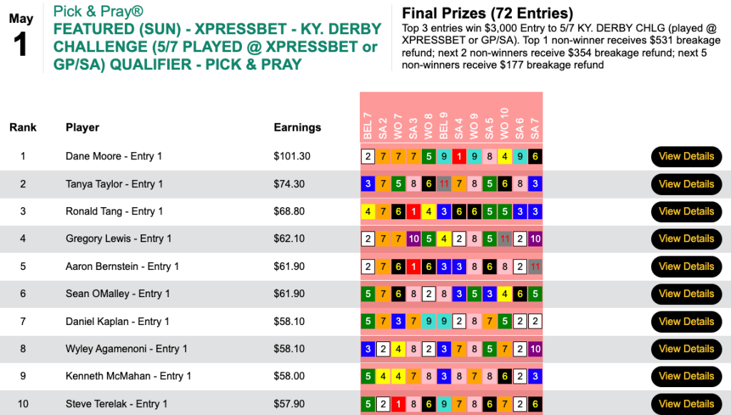 The same Pick & Pray selections also got Moore a $3,000 entry into the May 7 Kentucky Derby Challenge.