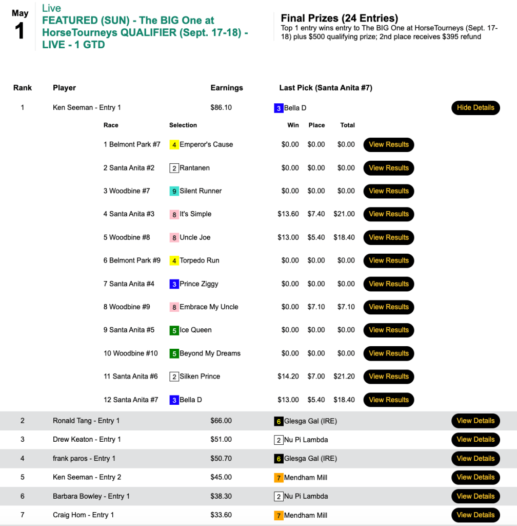 That’s Ken Seeman, who won $74,000 plus a Pegasus World Cup seat in last year’s “High Expectation Tourney.” On Sunday, he amassed 4 winners and 1 runner up to secure his return ticket to the event.
