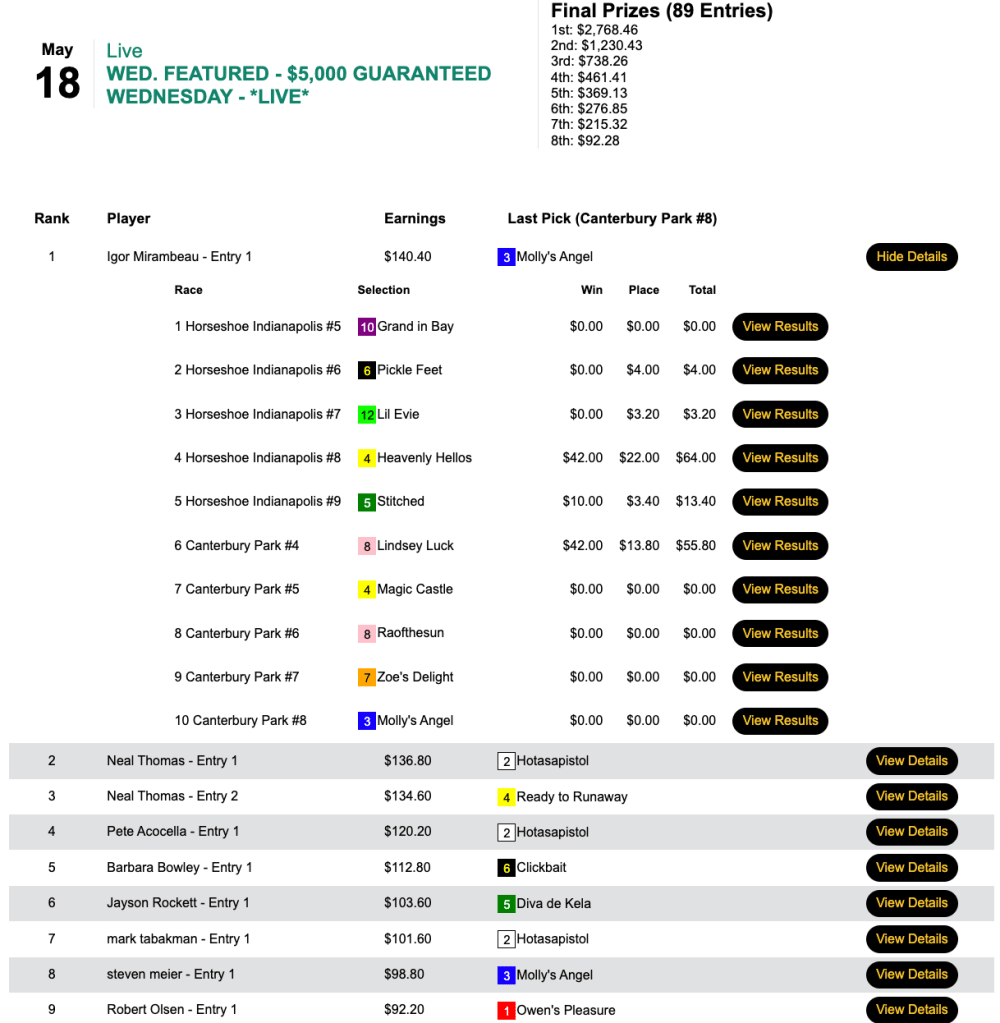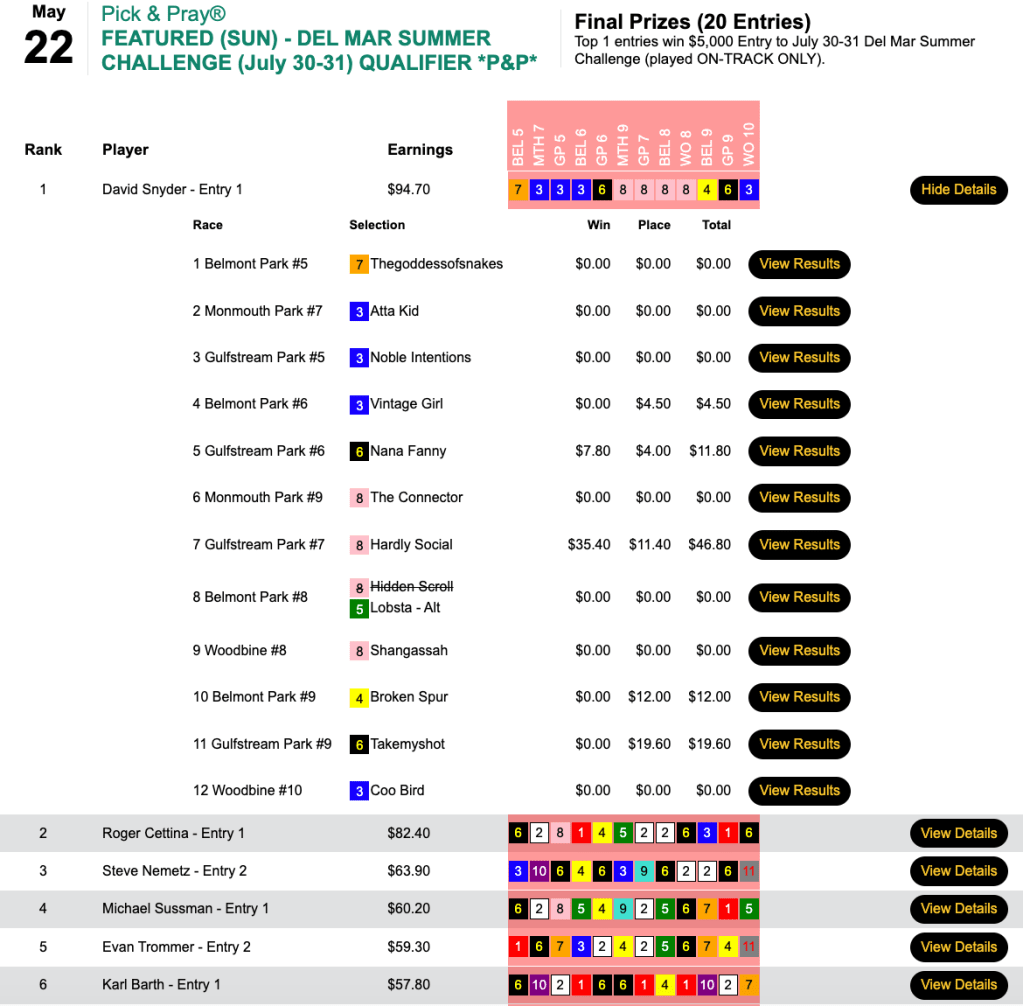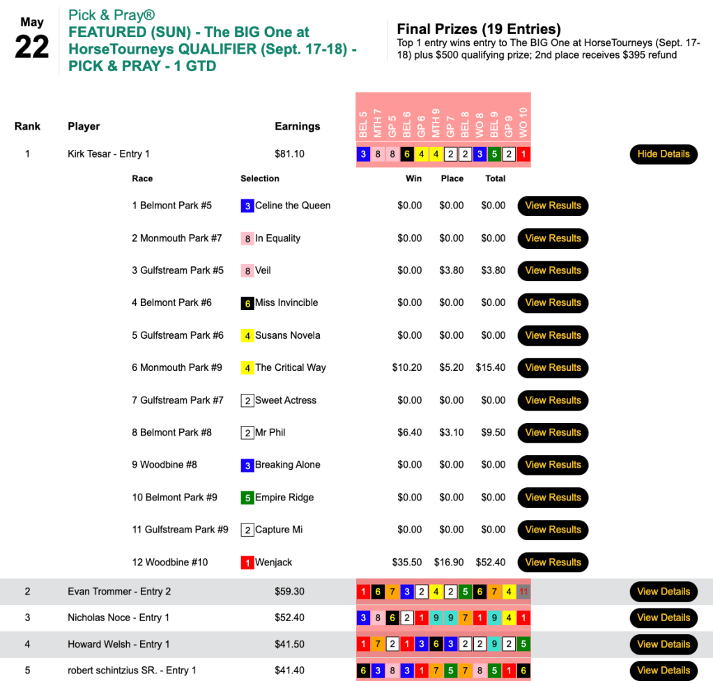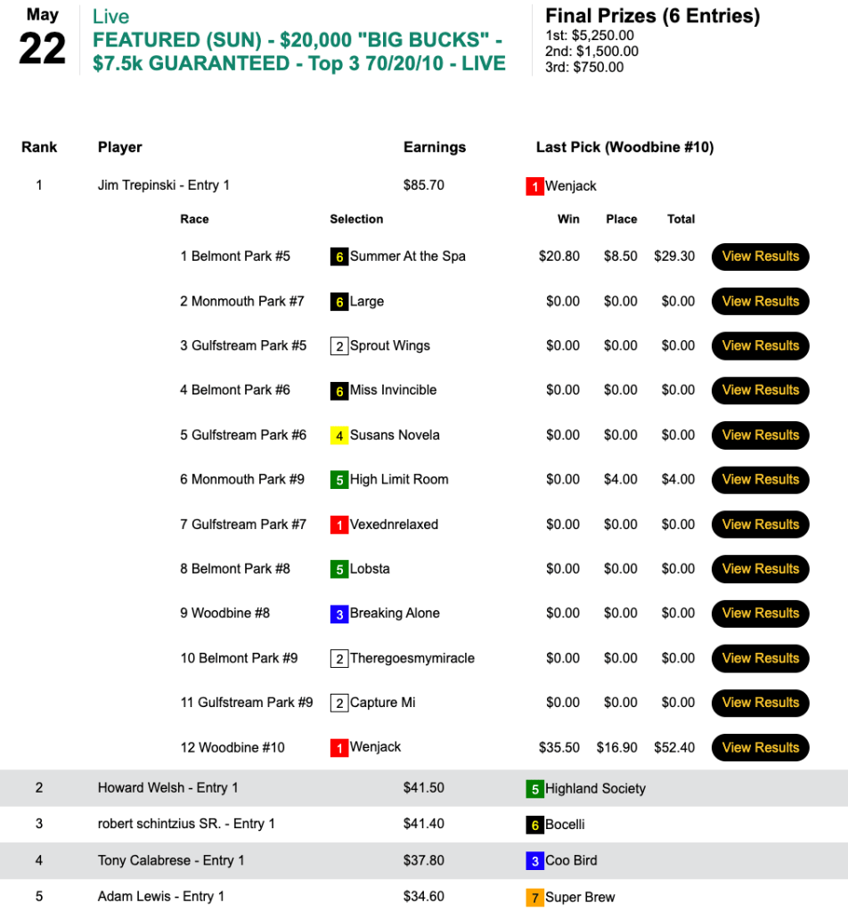 Trepinski was in the hunt late, but rather that try and edge his way to the top in the 6-entry game that was an 8% overlay proposition to participants, Trepinski blew his foes out of the water with 16-1 Wenjack. The result was a score more than twice that of his nearest foe…and a payday of $5,250.