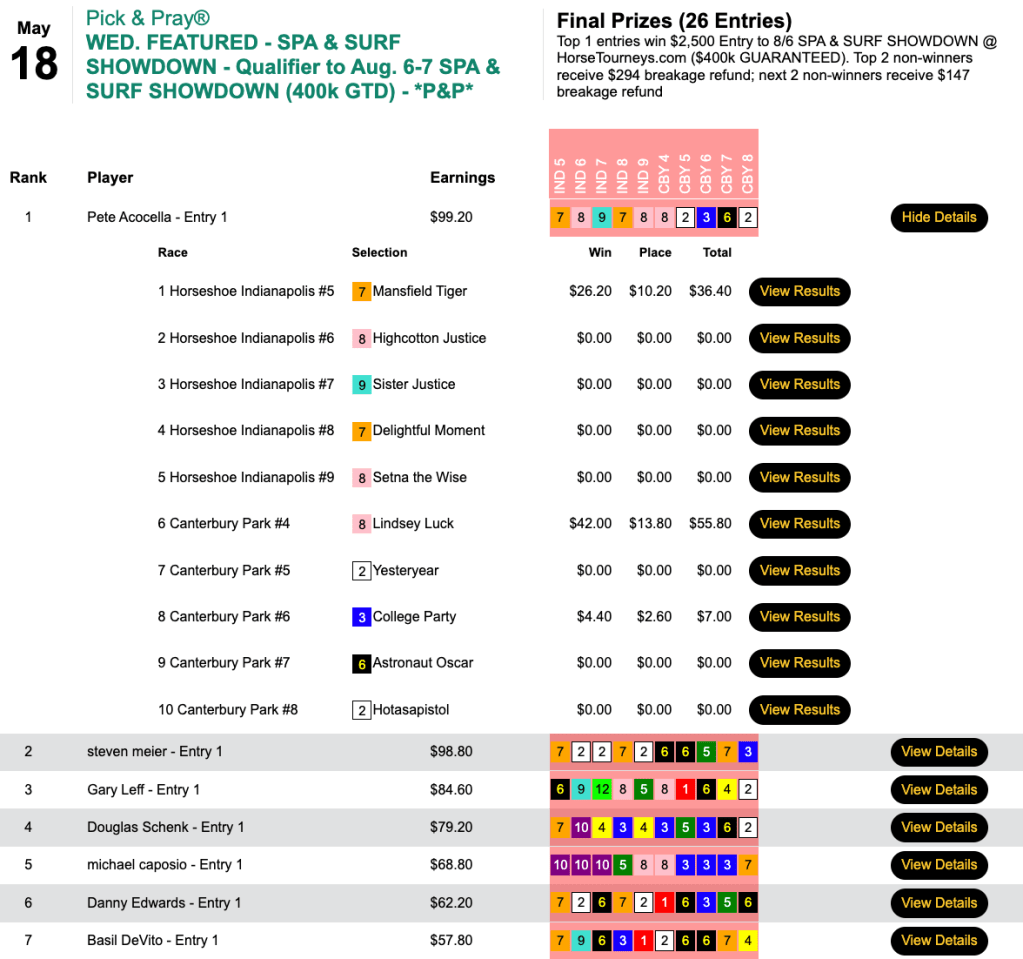 Acocella picked 3 winners, including Lindsay Luck ($45.40, $13.80) in the 4th at Canterbury Park to take Wednesday’s Spa & Surf Showdown qualifier—and he played the same picks in the day’s Monmouth Pick Your Prize play-in.