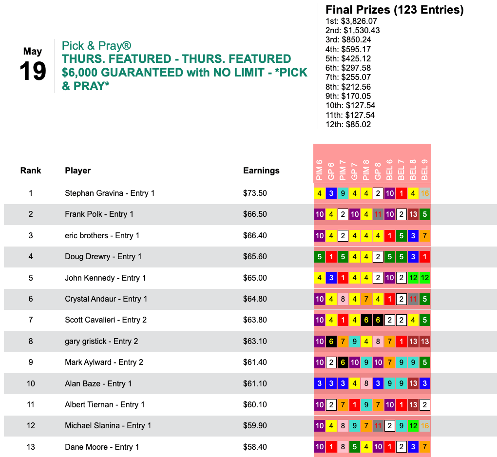 The day’s other feature, our $6,000 Guaranteed Pick & Pray, went to Stephan Gravina.