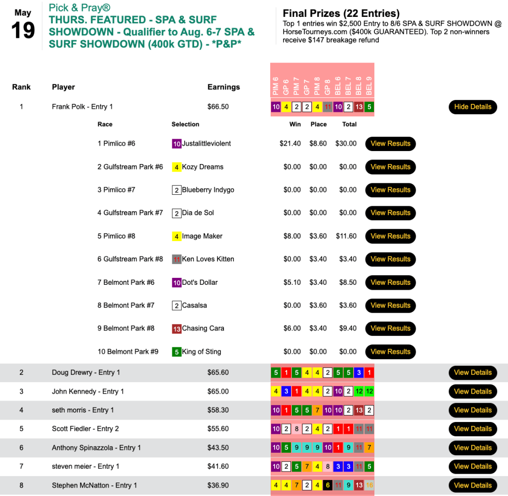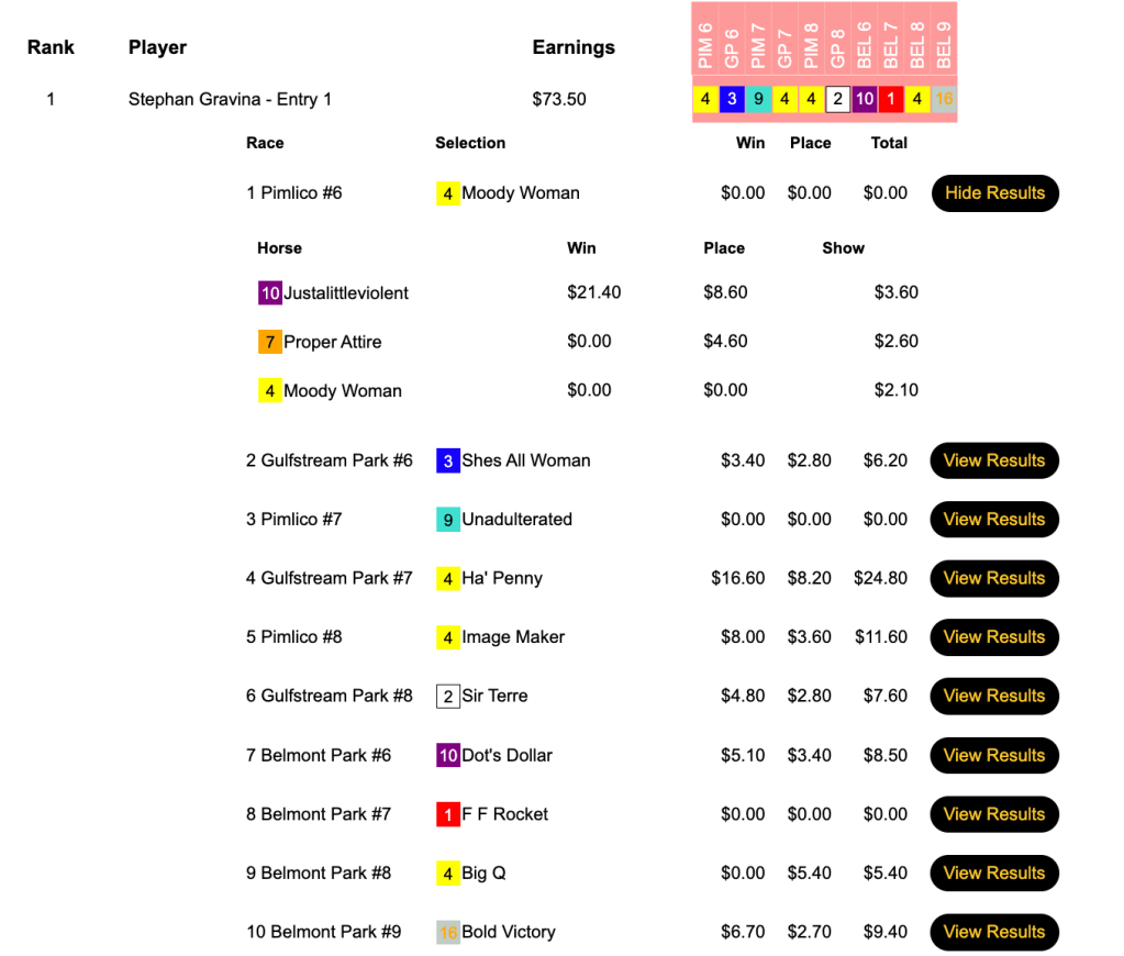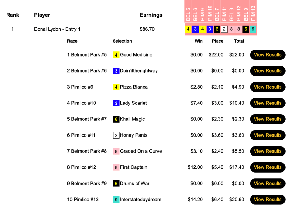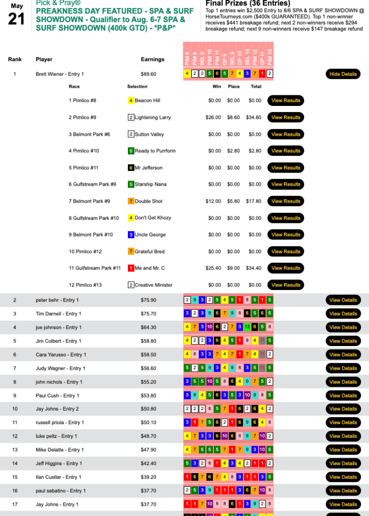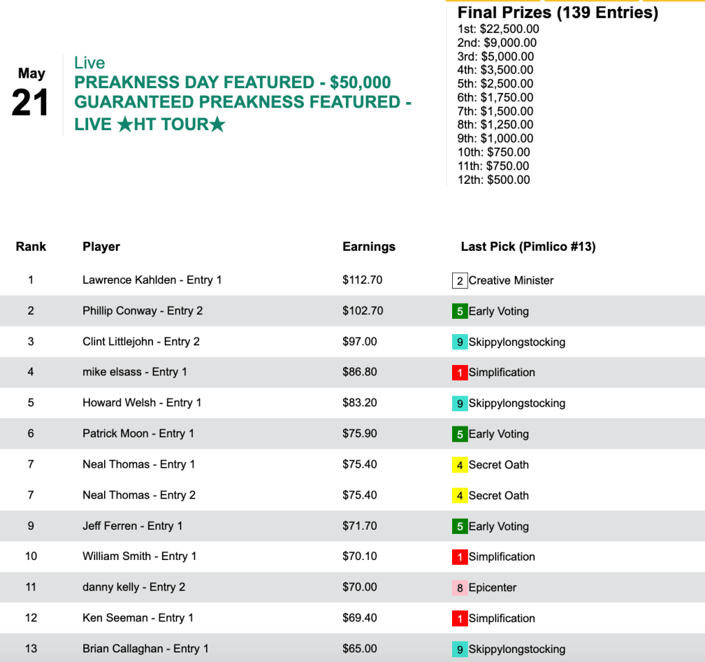 Michael Solakis had Early Voting in the Preakness among his 4 winners and 2 places, and he took home the top money of $11,250 in our $25,000 Guaranteed Preakness Day Pick & Pray (PDPP). This one had a takeout of just 3.8%.