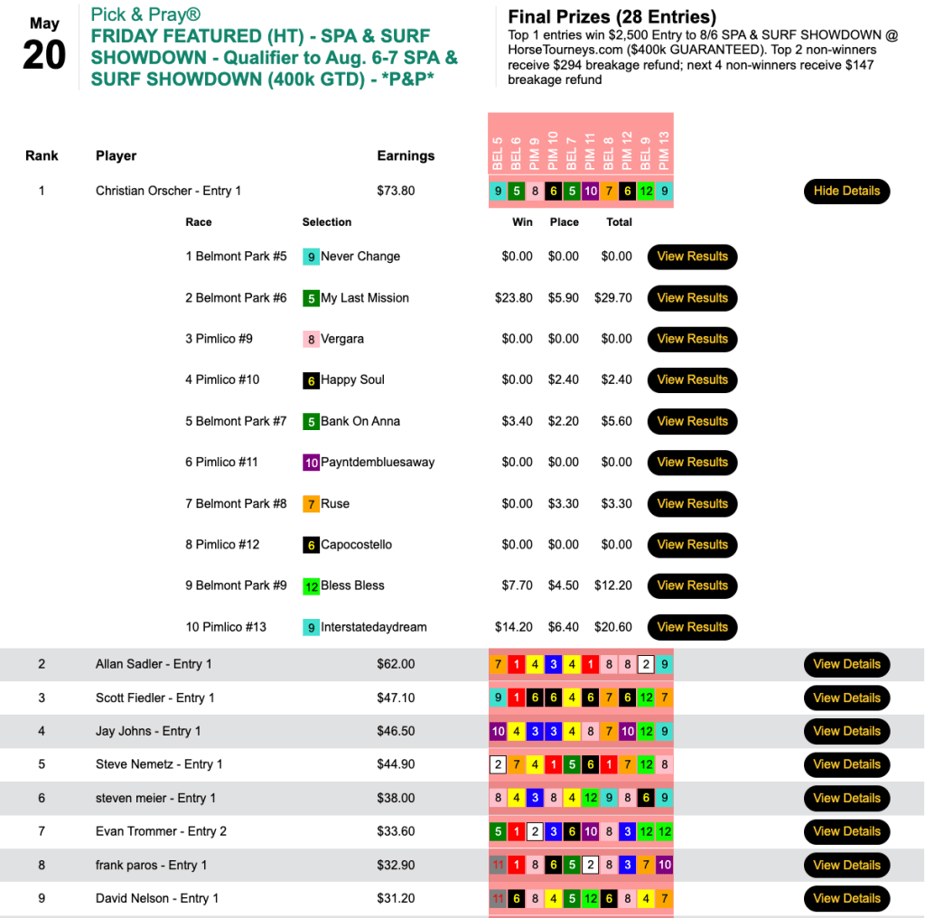 Friday’s high score came in the $75 NHC Pick & Pray at HorsePlayers, where the three to crack the $80 mark were the three to secure 2023 berths.