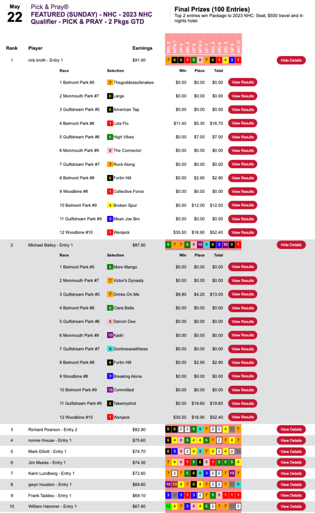 Broth finished with 2 wins and 3 places. Bailey, with Wenjack at the end and a big place collection right before that, wound up with 2 firsts and 2 seconds. They both wound up with seats to the 2023 NHC in exchange for their $210 investments in the HorsePlayers competition.