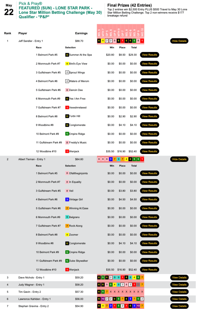 In terms of first-place runners, the bookend winners were all Sandler had in Sunday’s last chance Lone Star Million Betting Championship qualifier…though he did augment his score further with a pair of runners up. Also earning a $2,500 seat plus a $500 travel stipend at the Lone Star Last Chance saloon was Albert Tiernan, whose only winner among 4 collections was late-day Woodbine winner Wenjack.