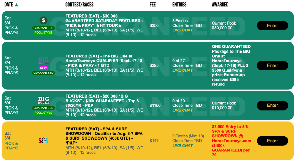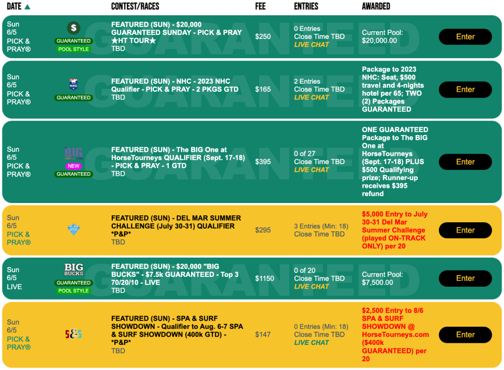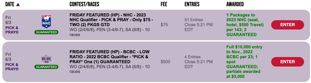 If you’re hunting for a 2023 NHC seat, set your sights right here at HorseTourneys on Sunday. This is where you’ll find a “regular,” $165 Pick & Pray with two spots certain.