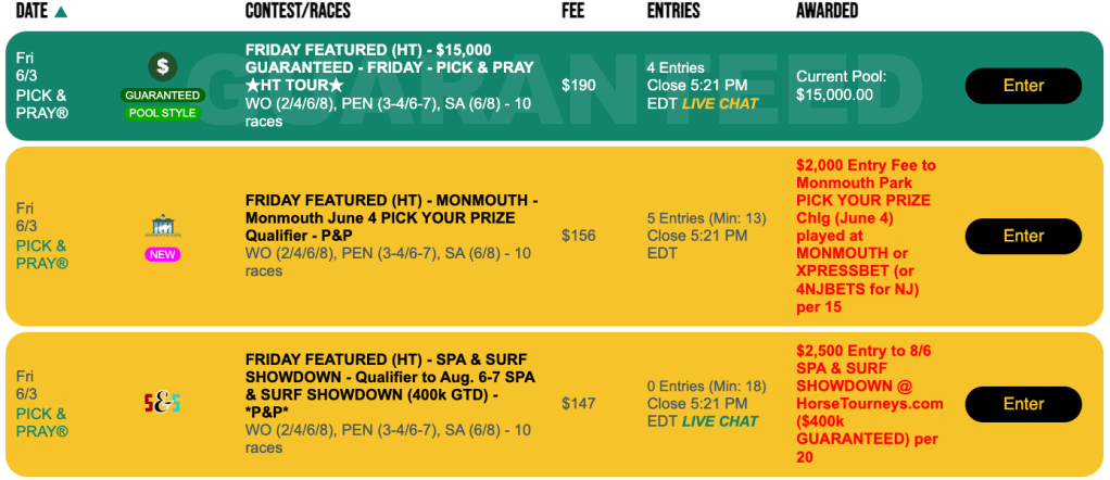 It’s hard to have been on the HorseTourneys site over the last couple of months without growing accustomed to qualifiers for the June 4 Monmouth Pick Your Prize Challenge. Well, the popular Monmouth event is now upon us, and because it is now a hybrid onsite/online competition, you can qualify for it right up through “Pick Your Prize Eve.” That Last Chance tourney is part of our Friday featured schedule.