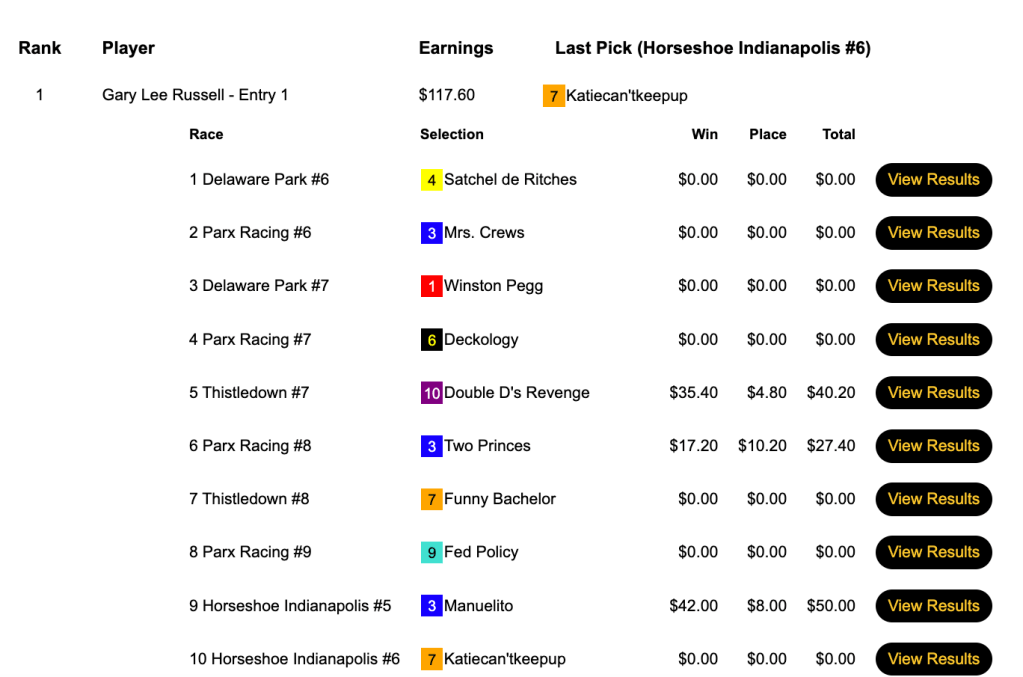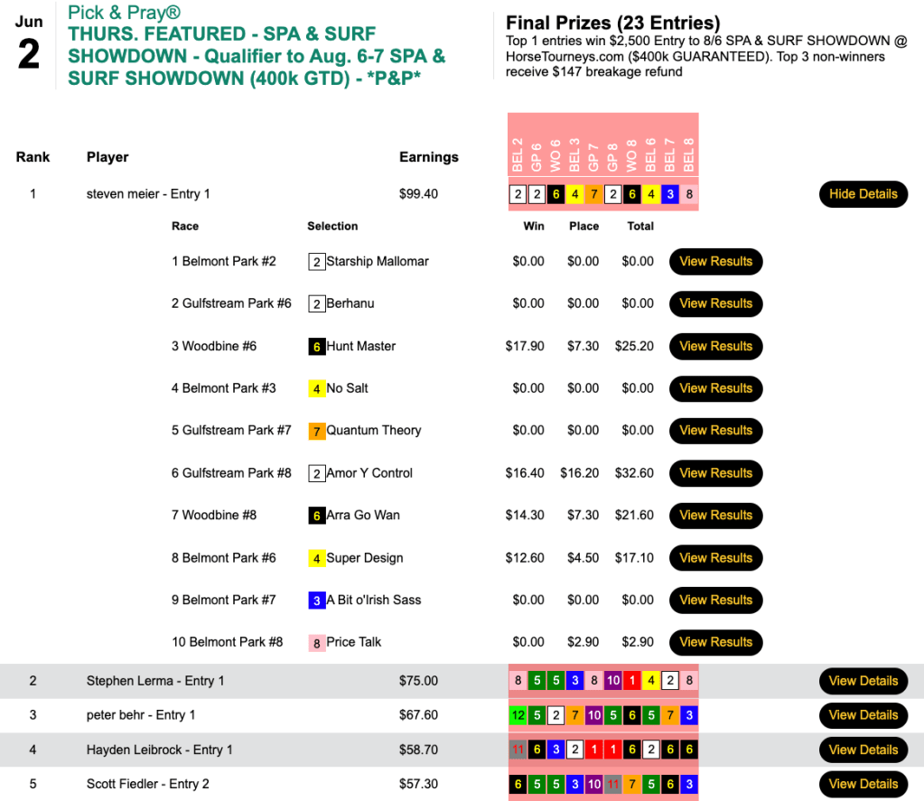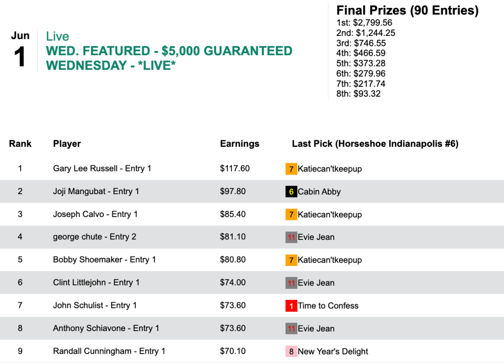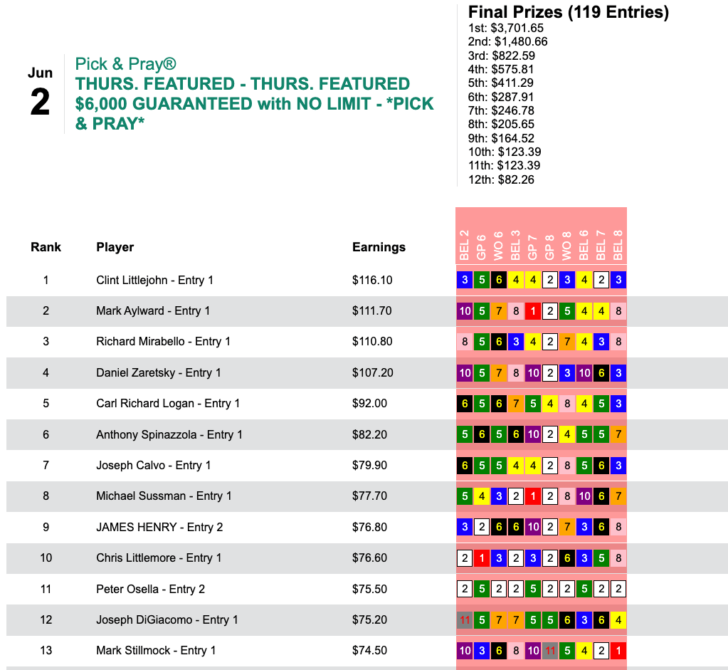 For that handicapping feat of strength, Littlejohn received $3,701 from a pot of $8,225 in Thursday’s $6,000 Guaranteed Pick & Pray.