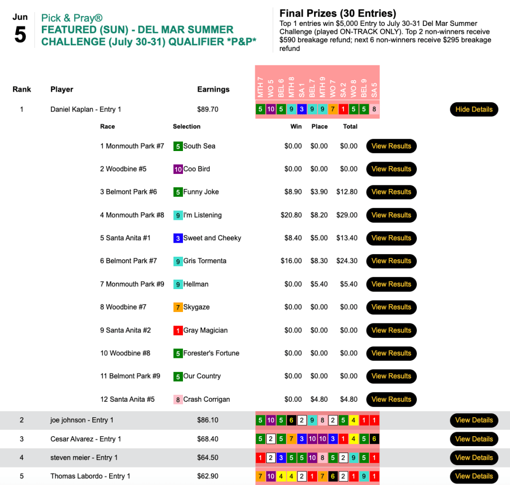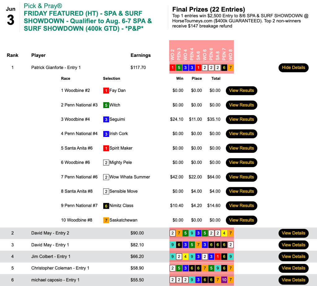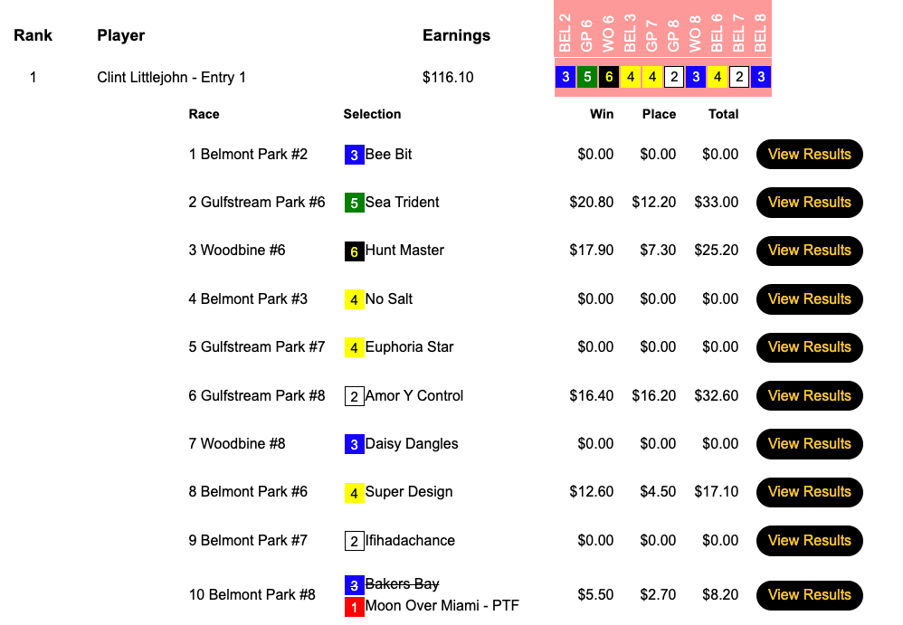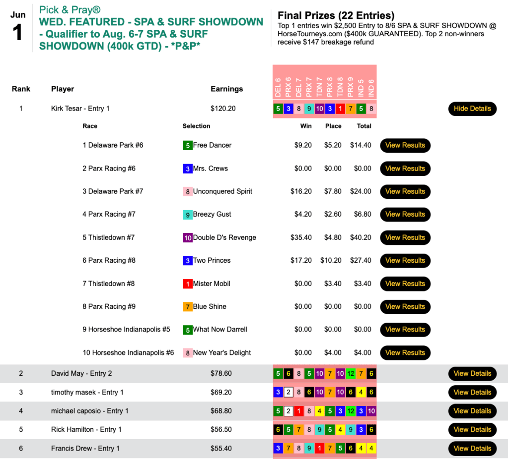 For that handicapping feat of strength, Littlejohn received $3,701 from a pot of $8,225 in Thursday’s $6,000 Guaranteed Pick & Pray.