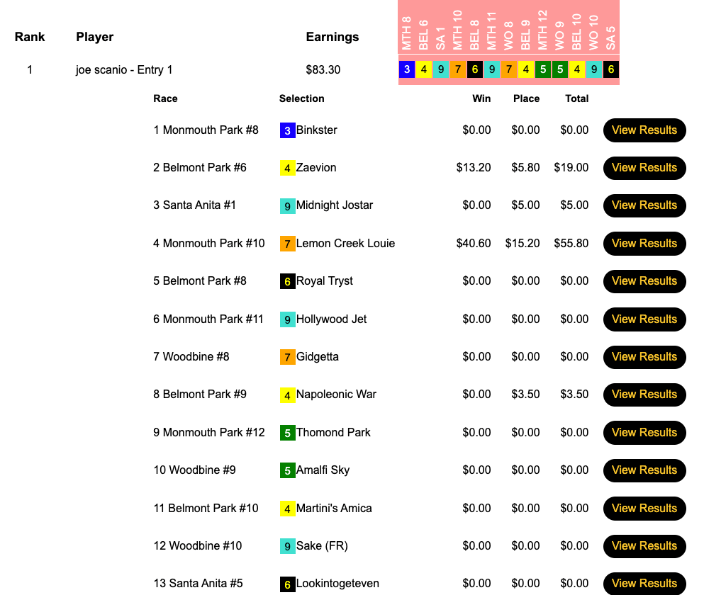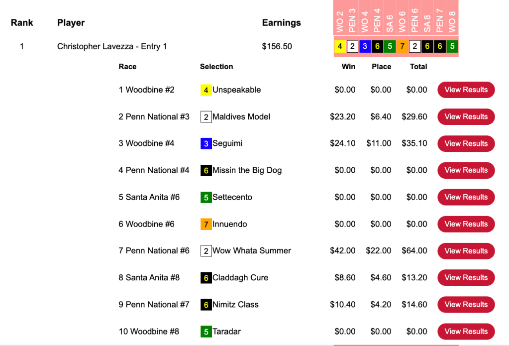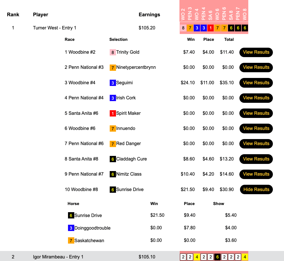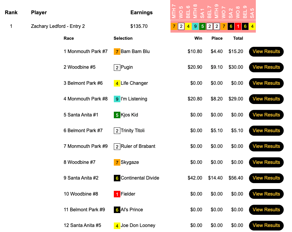 West picked the final three winners to get up by that dime. And in the final contest race, he needed to gain $30.90 to overtake Mirambeau, and that’s exactly (exactly!) what he got. They say that some jockeys have a stopwatch inside their head. West clearly has a totalizator inside his!