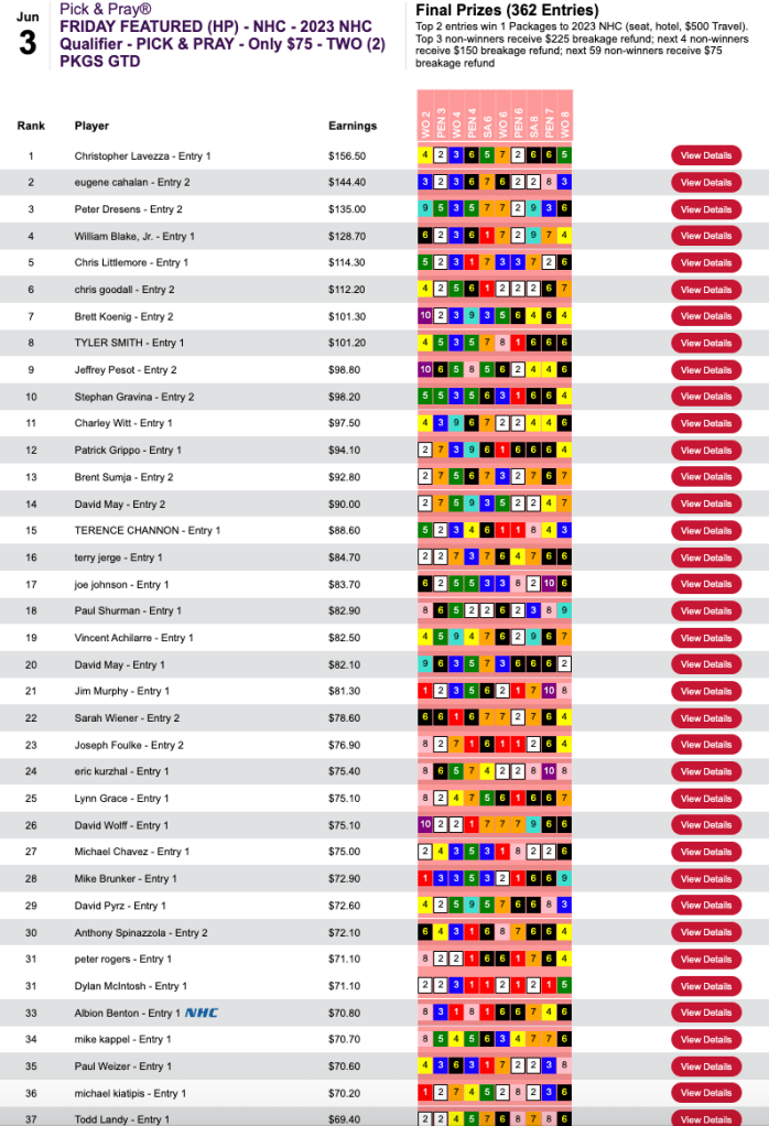 Ledford bagged $13,387 from a pot that wound up at a robust $29,750—and it was another “Zach attack” in Sunday’s $165 NHC Pick & Pray.