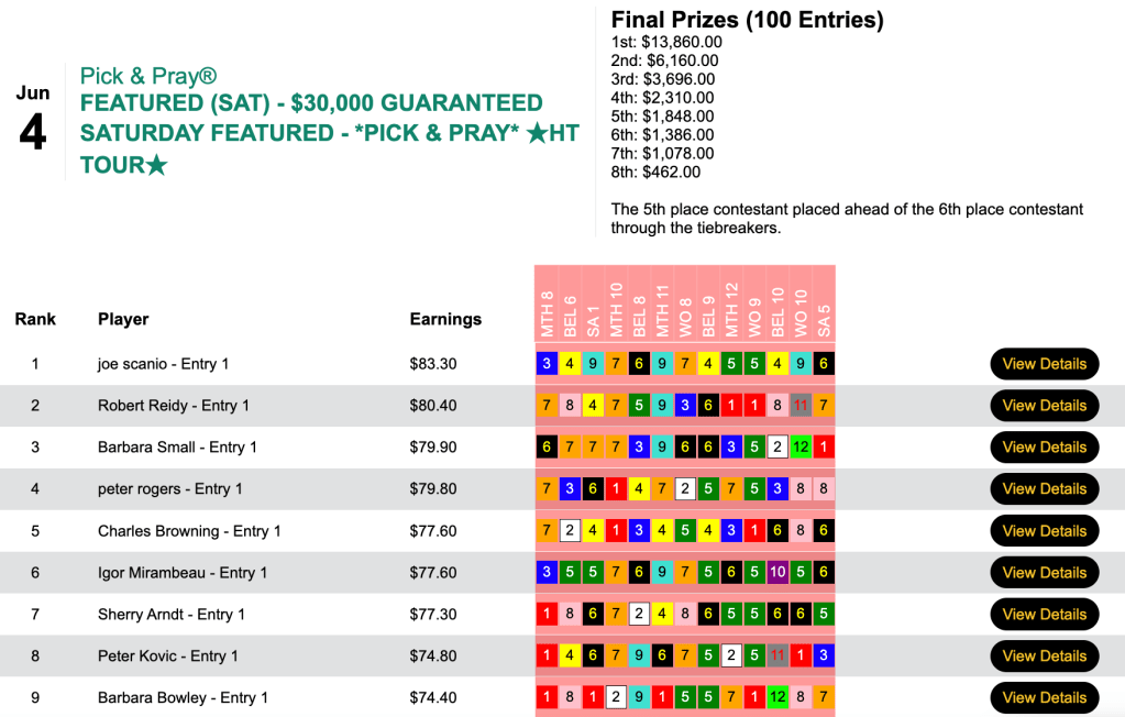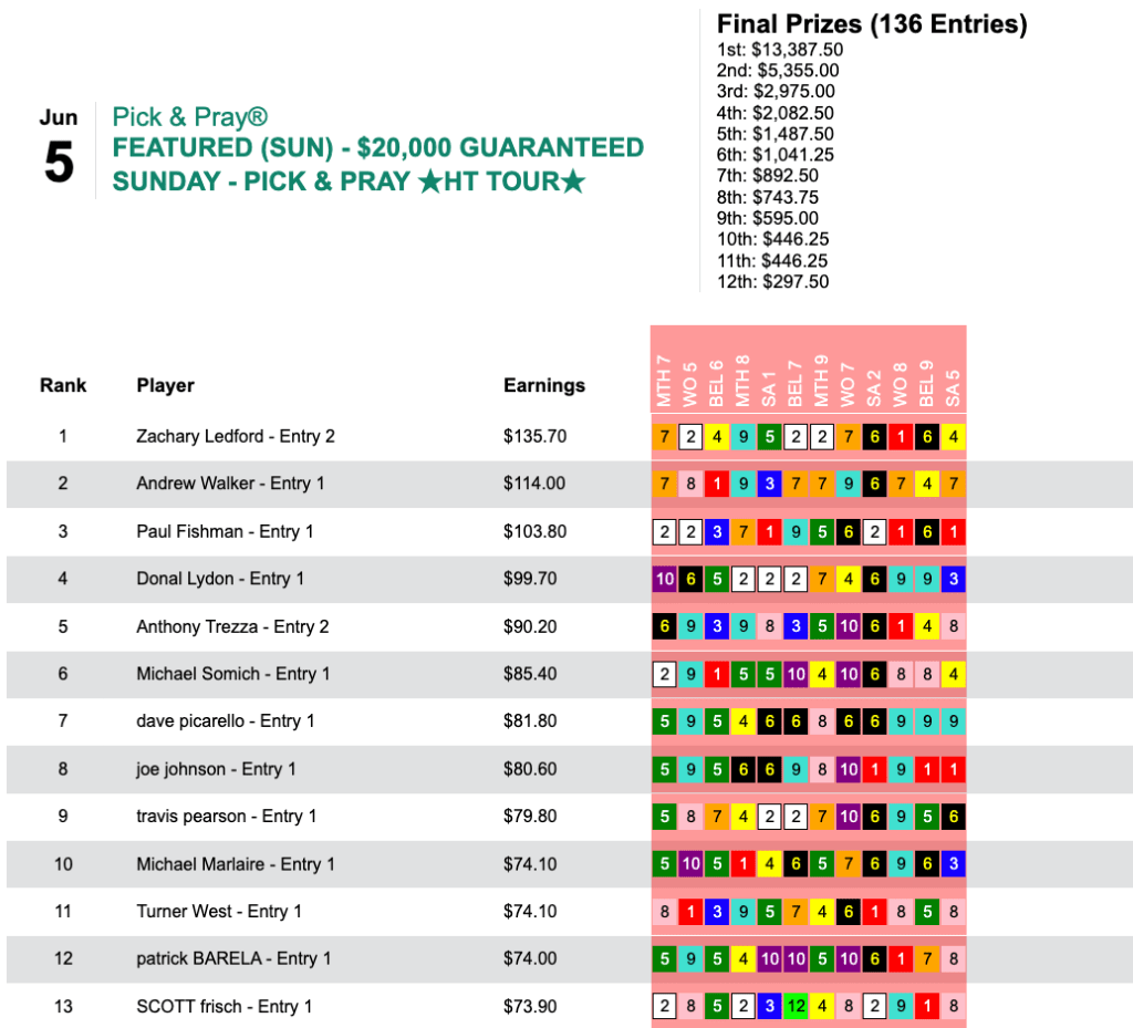 The 4-win, 1-place effort resulted in a nice cash/seat combo for Ledford, starting with a victory in Sunday’s HT Tour event, our $20,000 Guaranteed Pick & Pray.