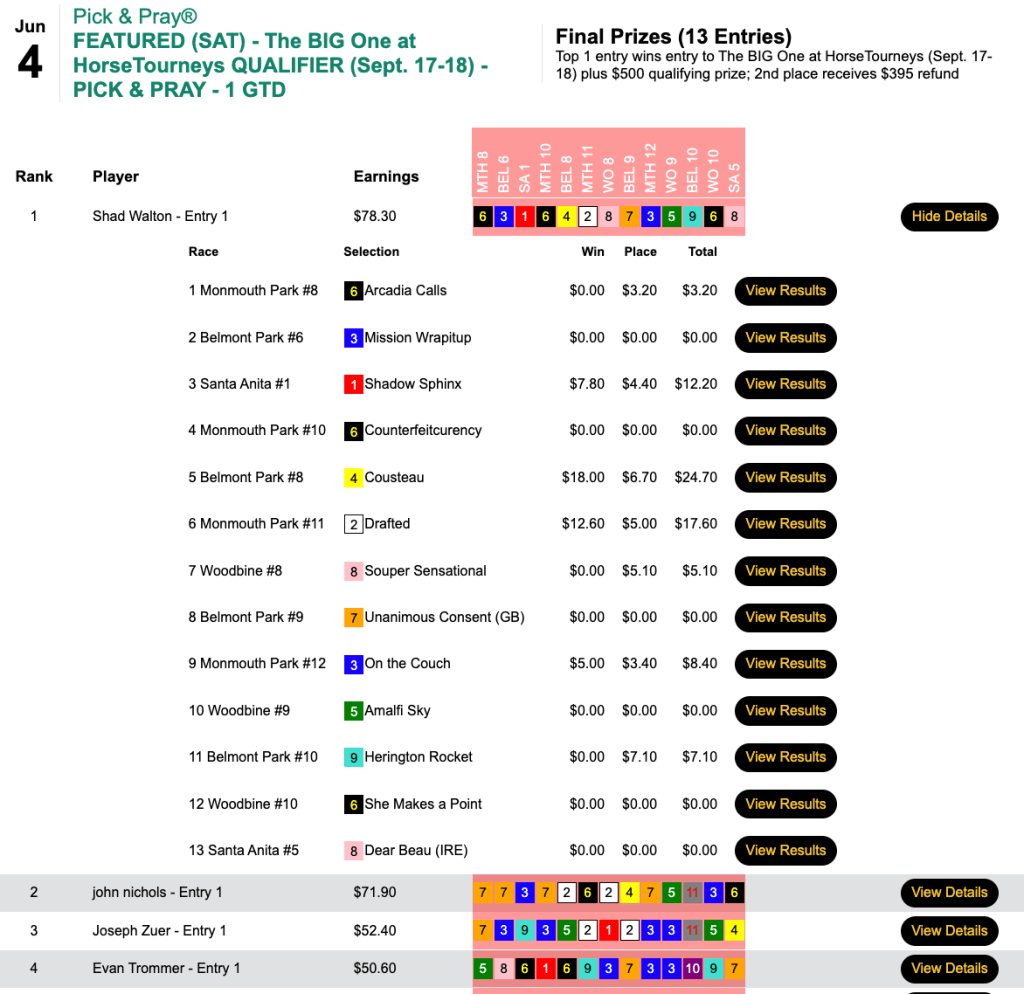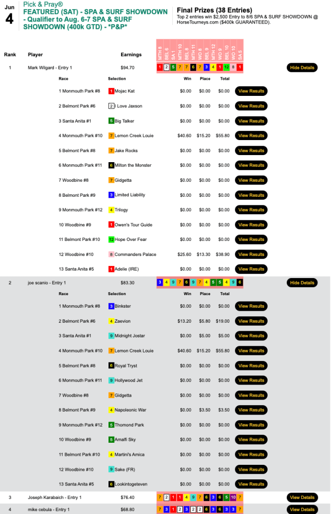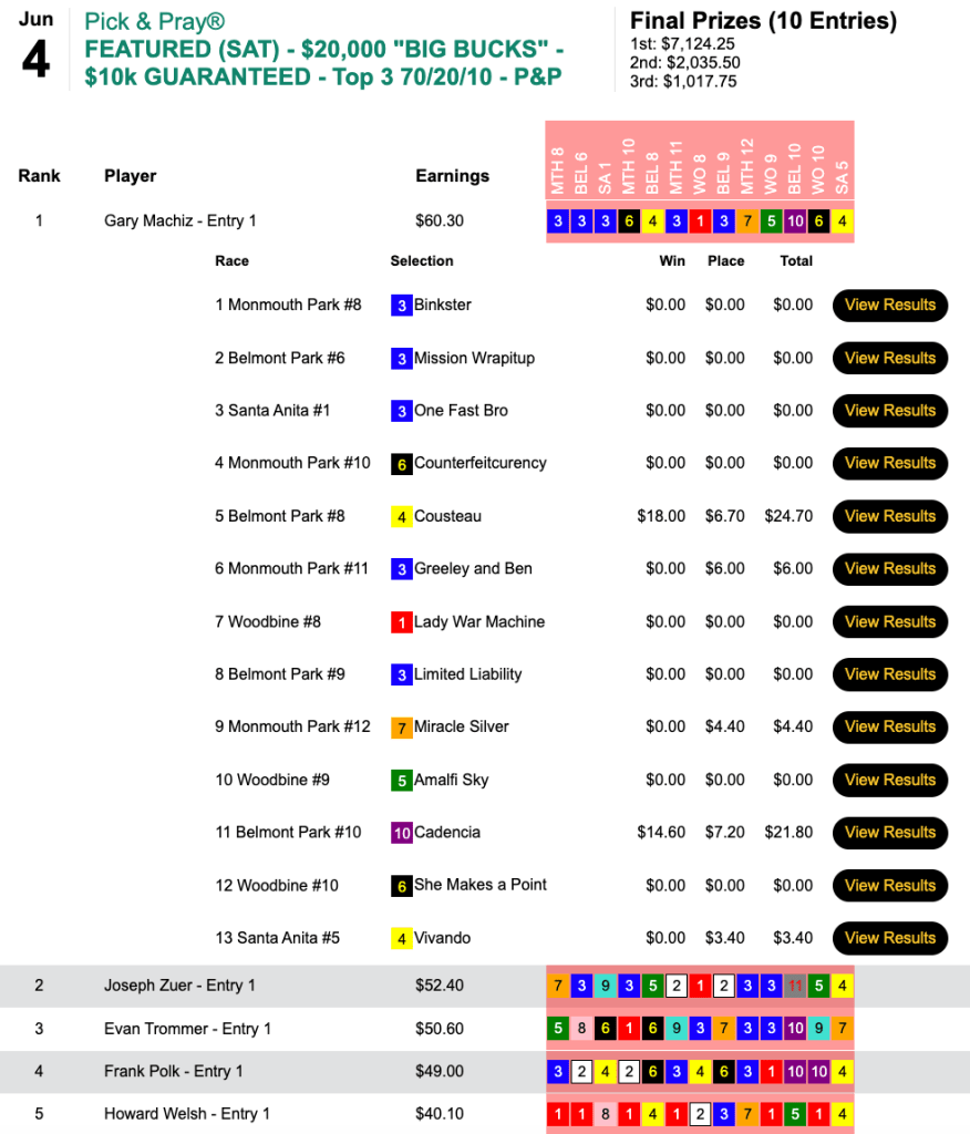 The 8-1 winner—along with another winner and two runners up—got the job done for Machiz in Saturday’s $10,000 Guaranteed Big Bucks Pick & Pray. Machiz’s winner’s share amounted to $7,124.