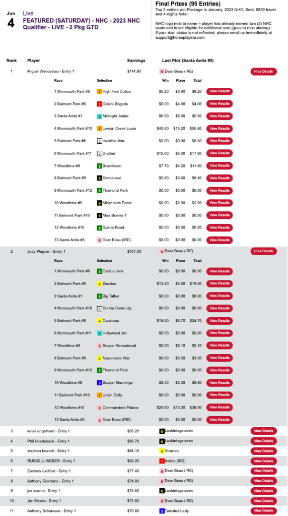 It was a fun week at HorseTourneys and HorsePlayers—particularly with respect to NHC qualifying. We saw one of the event’s most storied names win her way back to the 2023 renewal. Meanwhile, a similarly happy outcome befell one of the most talked-about participants in NHC history.