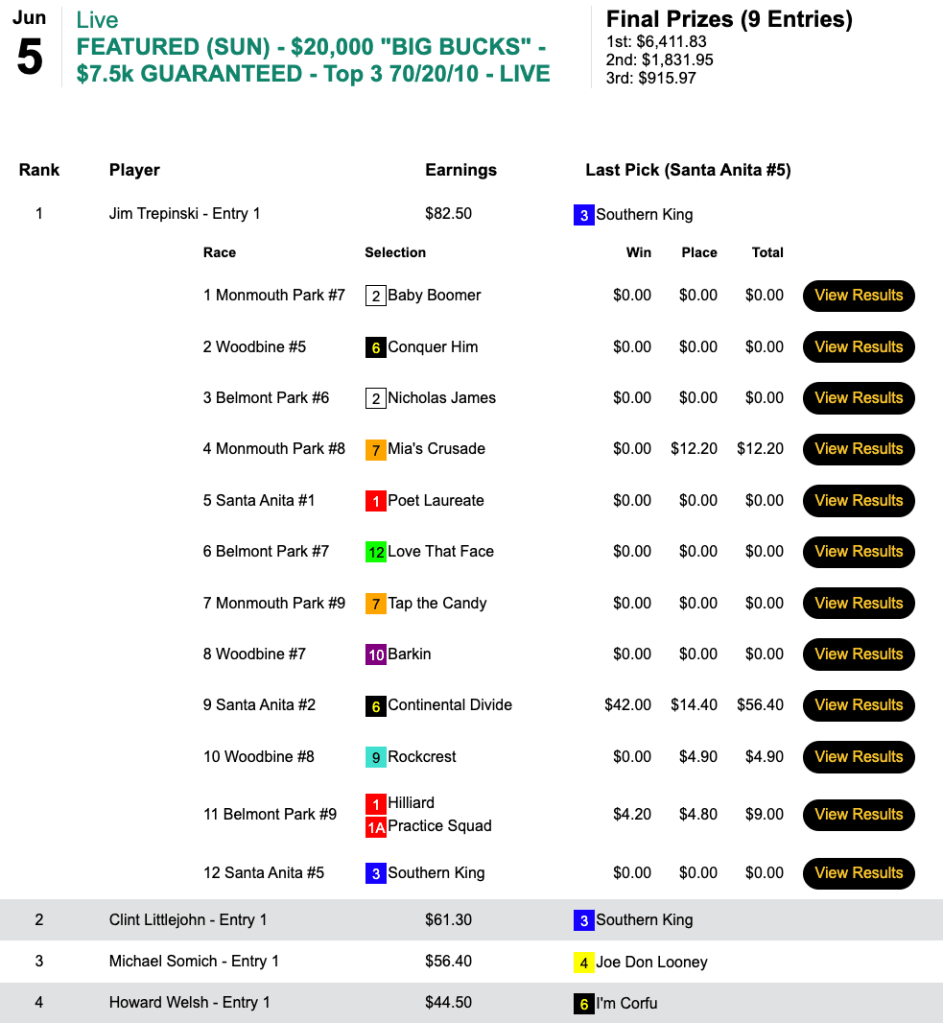 In other Sunday action, Jim Trepinski accounted for Sunday’s $7,500 Guaranteed Big Bucks game.