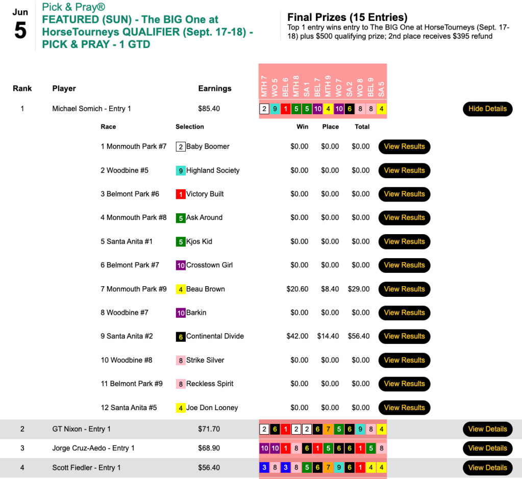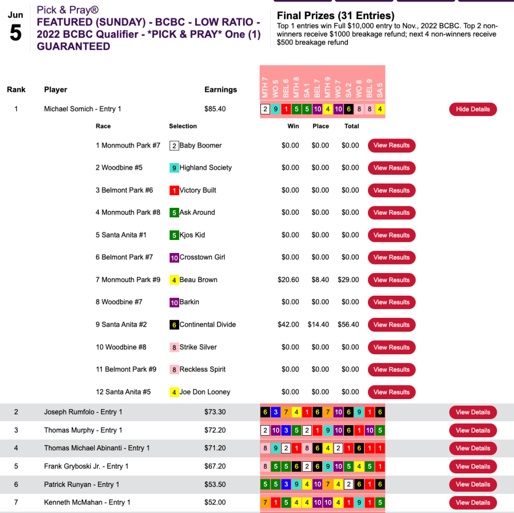 Somich captured Sunday’s qualifier for The BIG One, and he also led the way over at HorsePlayers in the Breeders’ Cup Betting Challenge Low Ratio Pick & Pray.