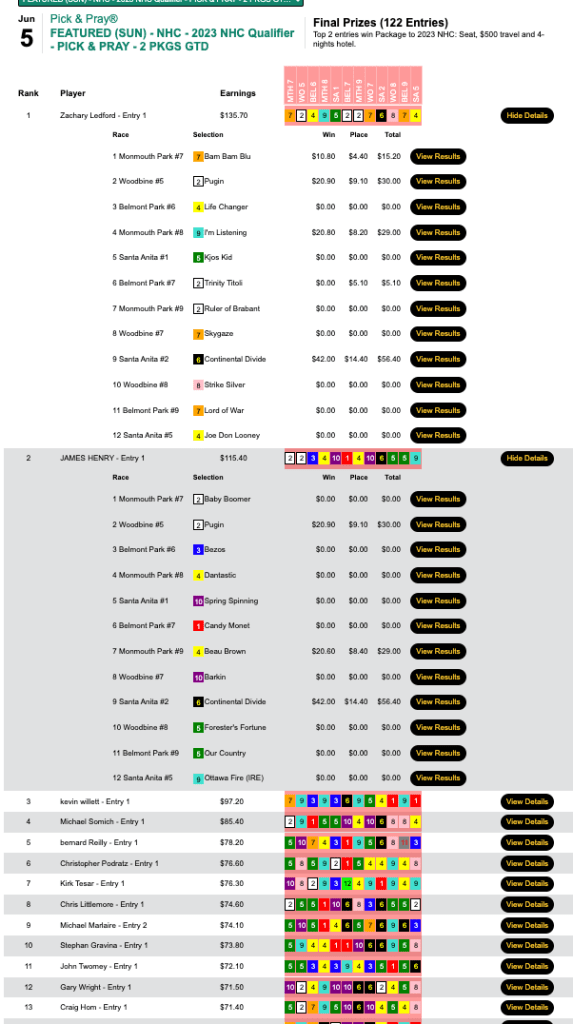Here, Ledford shared the spotlight with runner up and, thus, fellow 2023 seat recipient James Henry. All three of Henry’s winners paid at least $20.00.