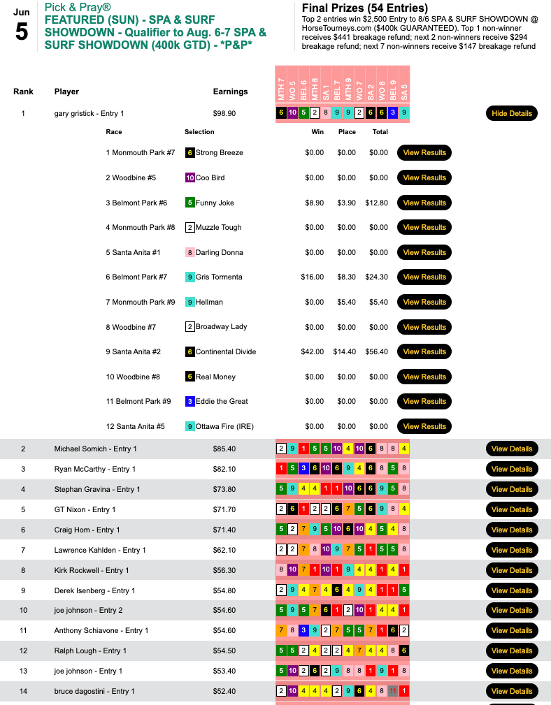 So ended another week here at Featured Tourney Central. Thanks to all of you for helping us get June off on such a positive note. The upcoming week figures to be bigger and even better with the Belmont Stakes anchoring one of the best race cards of the year on Saturday. There won’t be a Triple Crown. Hell, there won’t even be many Derby or Preakness horses—but the racing and the contest excitement should be truly excellent.