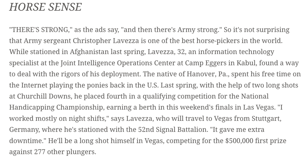 I’m still not sure what’s more amazing—qualifying for the NHC from Afghanistan…or races from Churchill Downs being part of an online contest!
