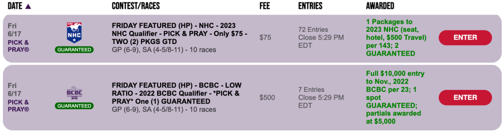 Regulars have come to know and love the low-cost, high-reward NHC play-in hosted each Friday at HorsePlayers—a $75 Pick & Pray with two seats guaranteed and a winning ratio of 1-per-143. It’s a great opportunity not only to land a 2023 spot, but also to pick up potentially valuable NHC Tour points. Entries are limited to three per person. Remember—you must be a 2022 NHC Tour member, prior to the start of the contest, in order to be eligible for an NHC package in this or any other NHC qualifier. If you’re not a member, you can become one quickly and easily at NTRA.com for a $50 membership fee.