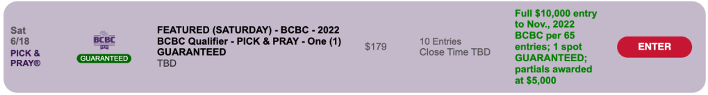 A $10,000 BCBC entry can be yours in a $179 Pick & Pray with a winning ratio of 1-per-65. At least one November berth is guaranteed no matter how many (or few) take part.