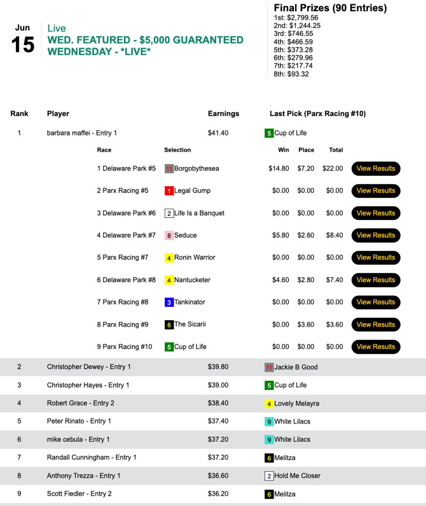 The juiciest winner of the day was Borgobythesea ($14.80, $7.20) in the first contest race, race 5 at Delaware, and Barbara Maffei had it. She earned $2,799 for capturing Wednesday’s $5,000 Guaranteed cash tourney, which finished things up with a pot of $6,221. Her score over the 9-race event was $41.40.