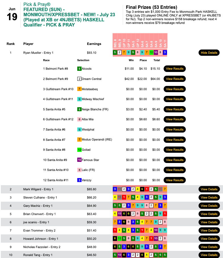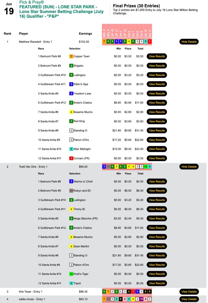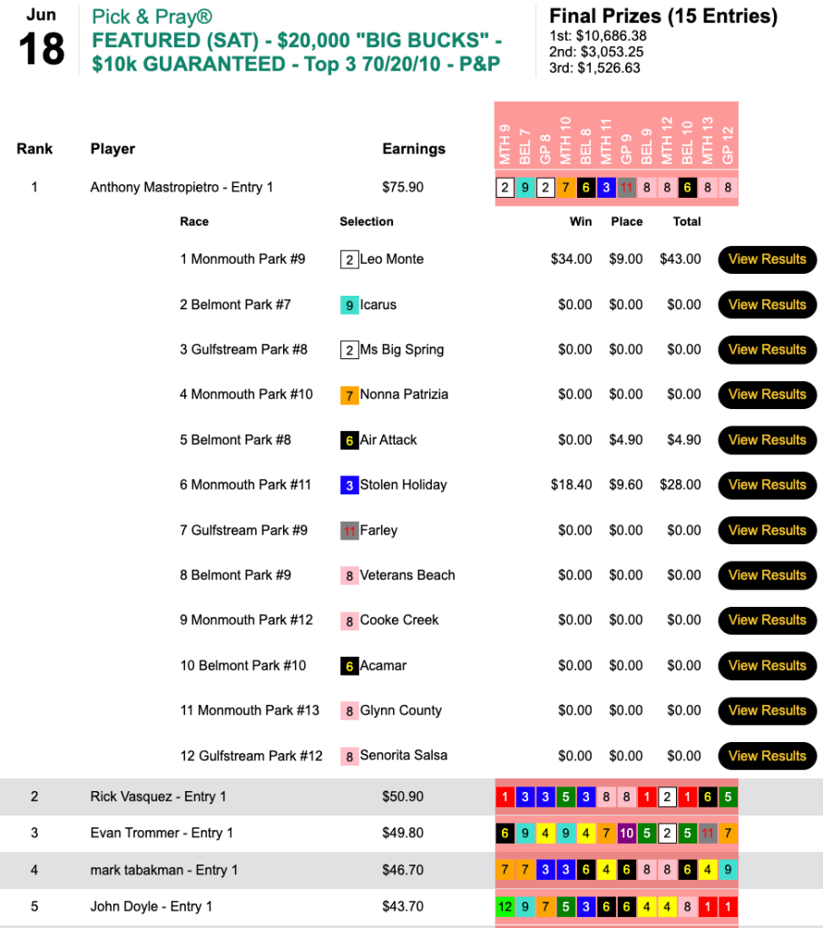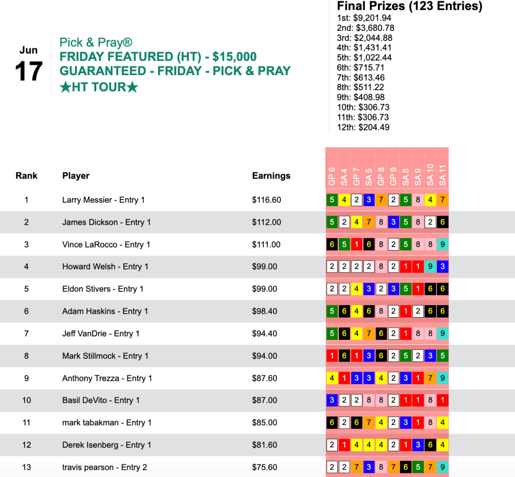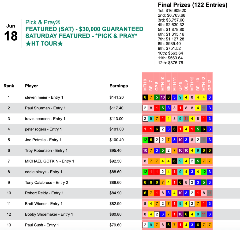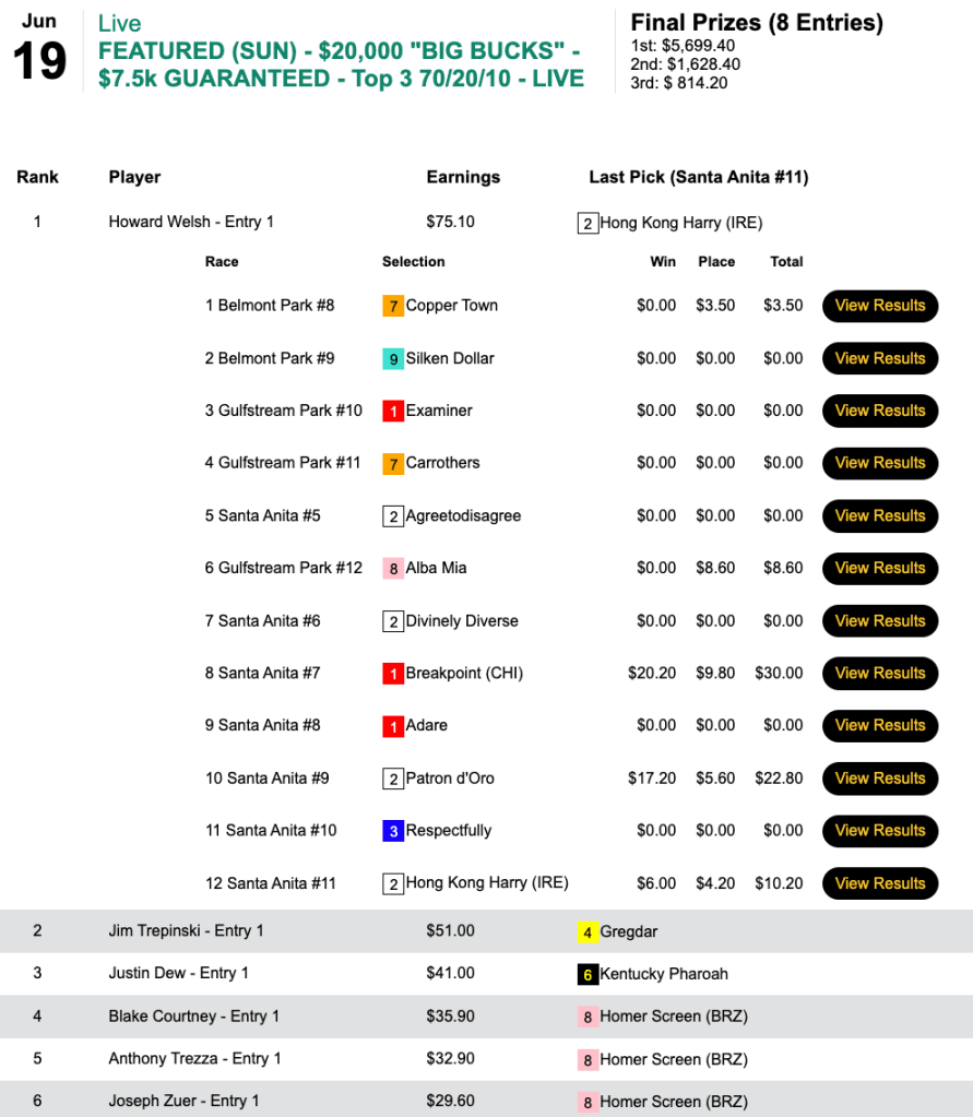…and that was a big part of Kieras winning $12,600 in Sunday’s HT Tour game, our $20,000 Guaranteed Father’s Day Pick & Pray, which shut down with an even $28,000 in the kitty. Kieras made collections in each of the first 6 races.