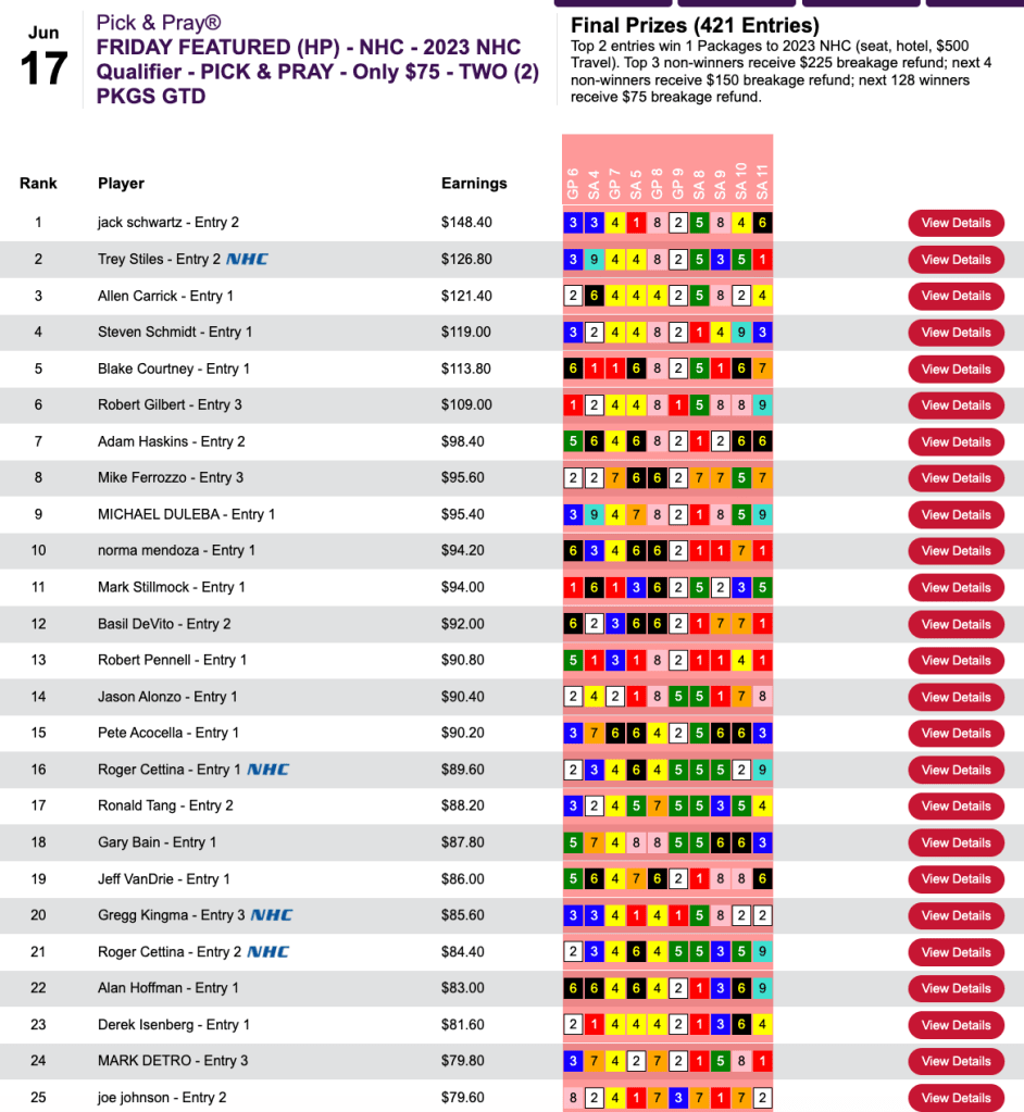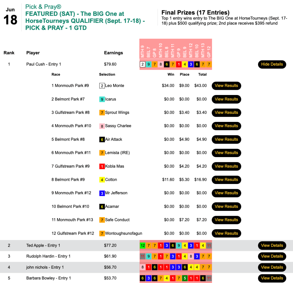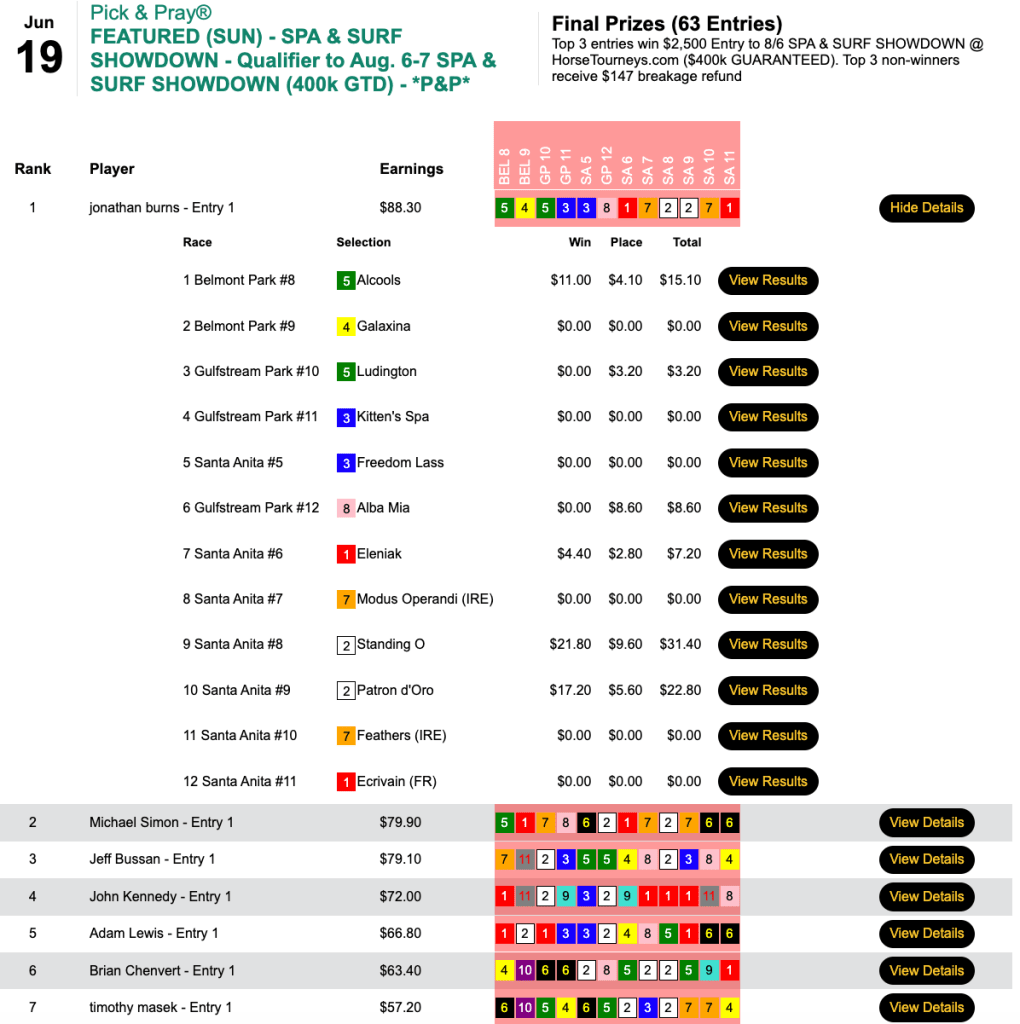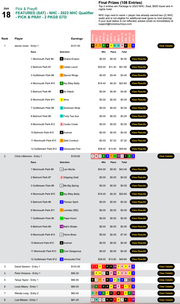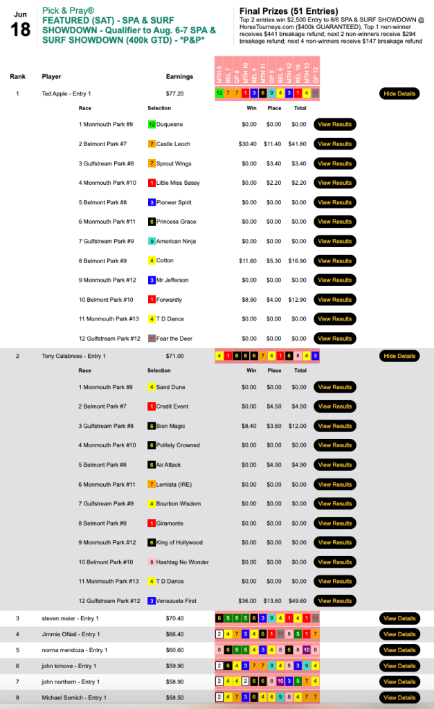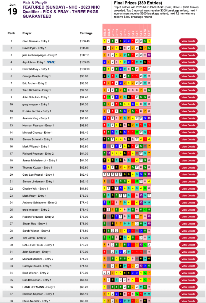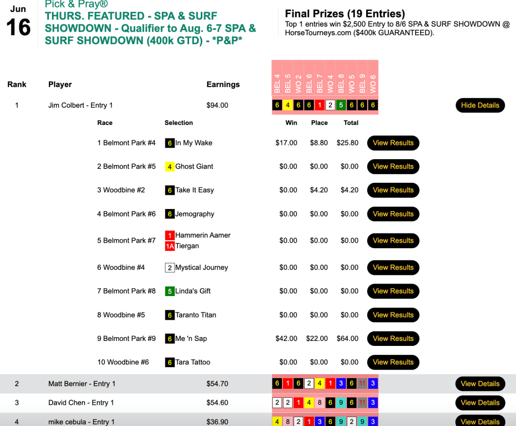 …and that was a big part of Kieras winning $12,600 in Sunday’s HT Tour game, our $20,000 Guaranteed Father’s Day Pick & Pray, which shut down with an even $28,000 in the kitty. Kieras made collections in each of the first 6 races.