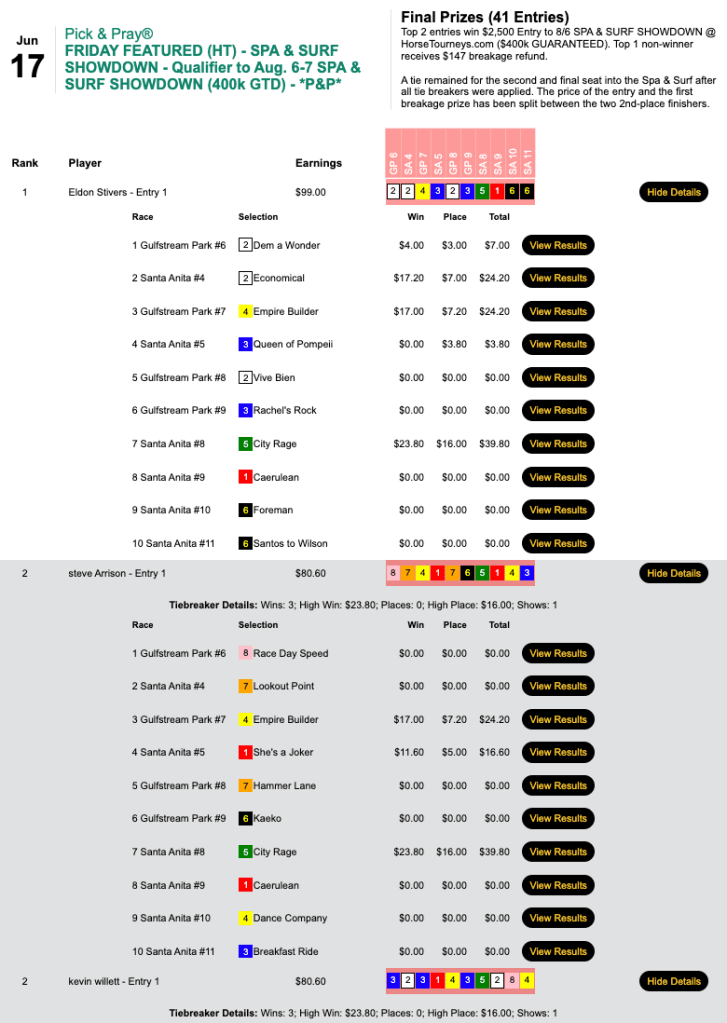 Eldon Stivers nailed the first 3 winners and finished with 4 firsts plus a second to get the lone $2,500 seat in this “two seater.” The two seater became a one seater, though, because Steve Arrison and Kevin Willett finished in a flat-footed tie for second. Not only did they have the same three winners…not only did neither one have a runner up…they also finished tied in third-place finishers (one apiece). So they split the value of the second seat ($2,500) plus the 3rd-place breakage refund ($147) equally.