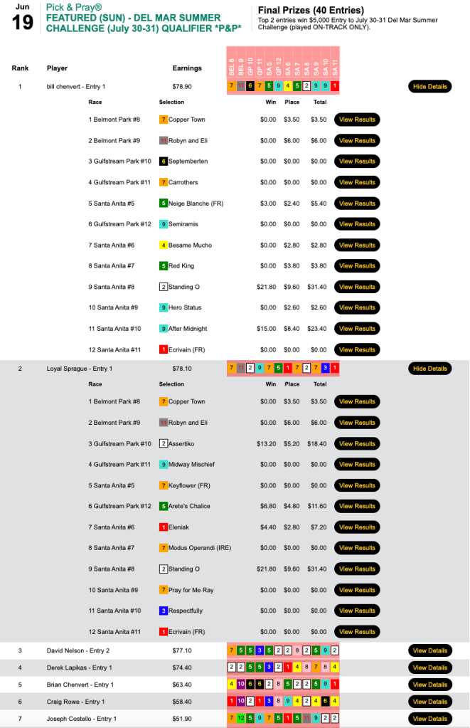 …but that didn’t stop them from winning $5,000 entries in Sunday’s tightly-contested Del Mar Summer Challenge qualifier. The best return for each came with Standing O.