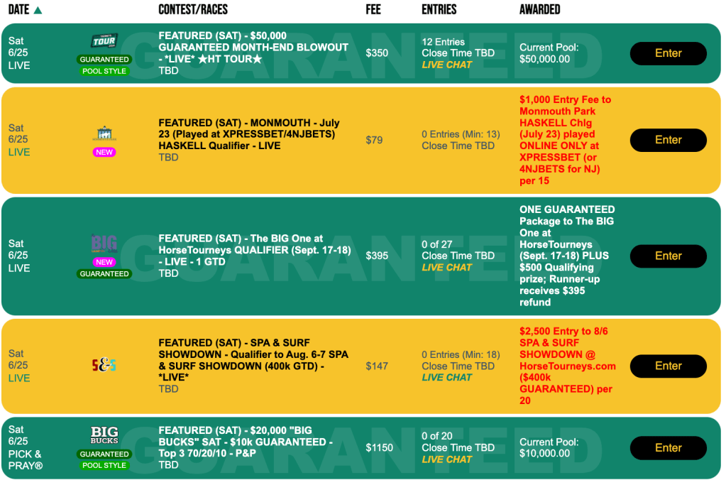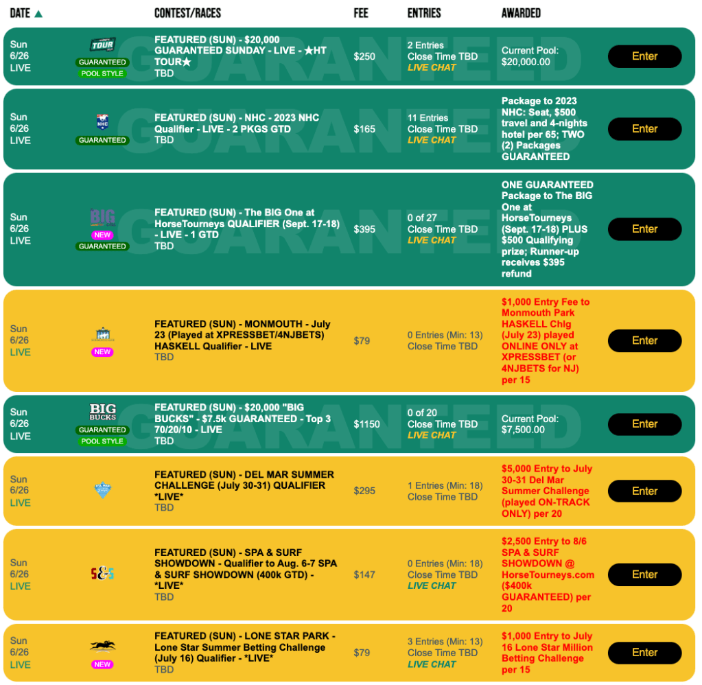 Also easily viewable on the HorseTourneys and HorsePlayers sites are an array of 21 featured events—the first five of which take place on Friday.