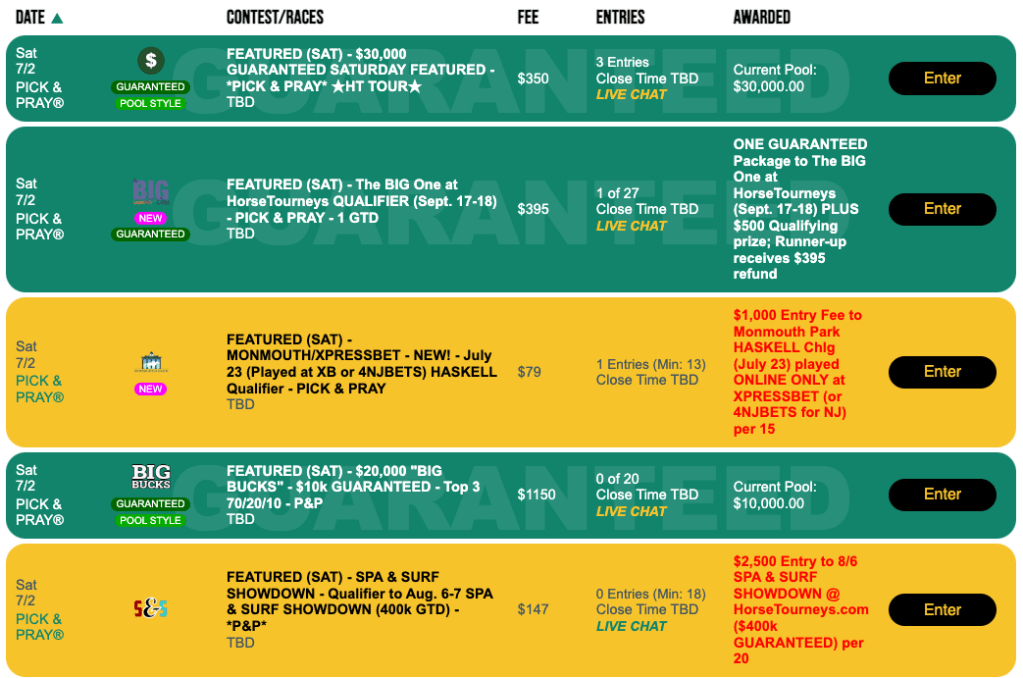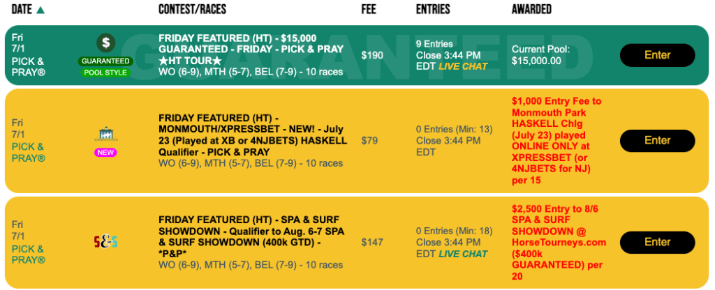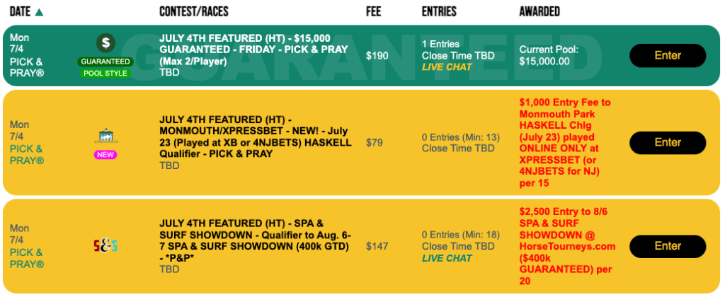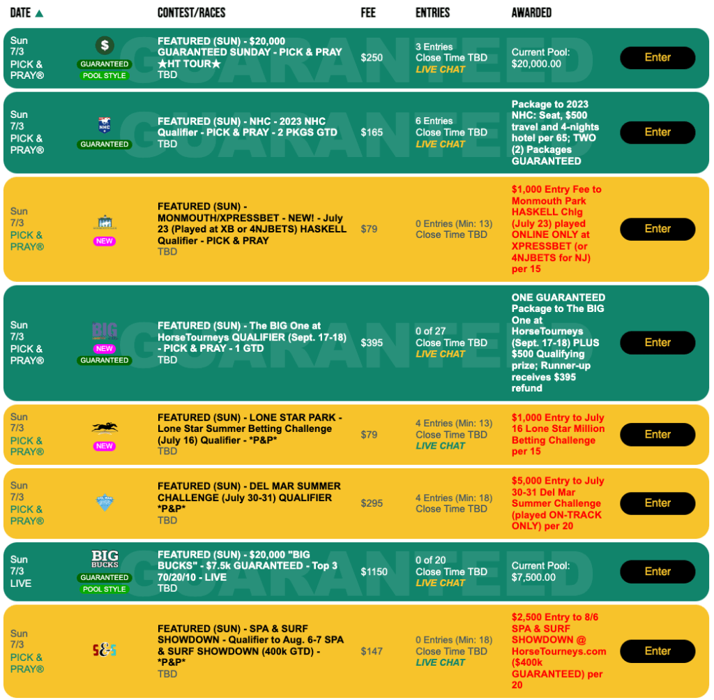 Another upcoming on-track tournament is the Lone Star Summer Betting Challenge, which takes place on July 16 at Lone Star Park in Grand Prairie, Tex., near Dallas. Entries for the Lone Star Summer Betting Challenge will cost you $1,000 on July 16. However, you can get one on Sunday for $79 if you do well in our Pick & Pray. The play-in’s entry fee is $79.