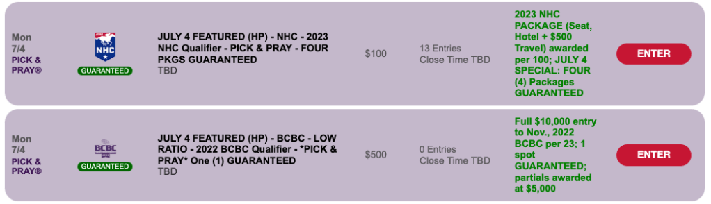 The Sunday NHC qualifier takes place right here—It’s a “regular,” $165 Pick & Pray with two entries assured. The winning ratio is 1-per-65.