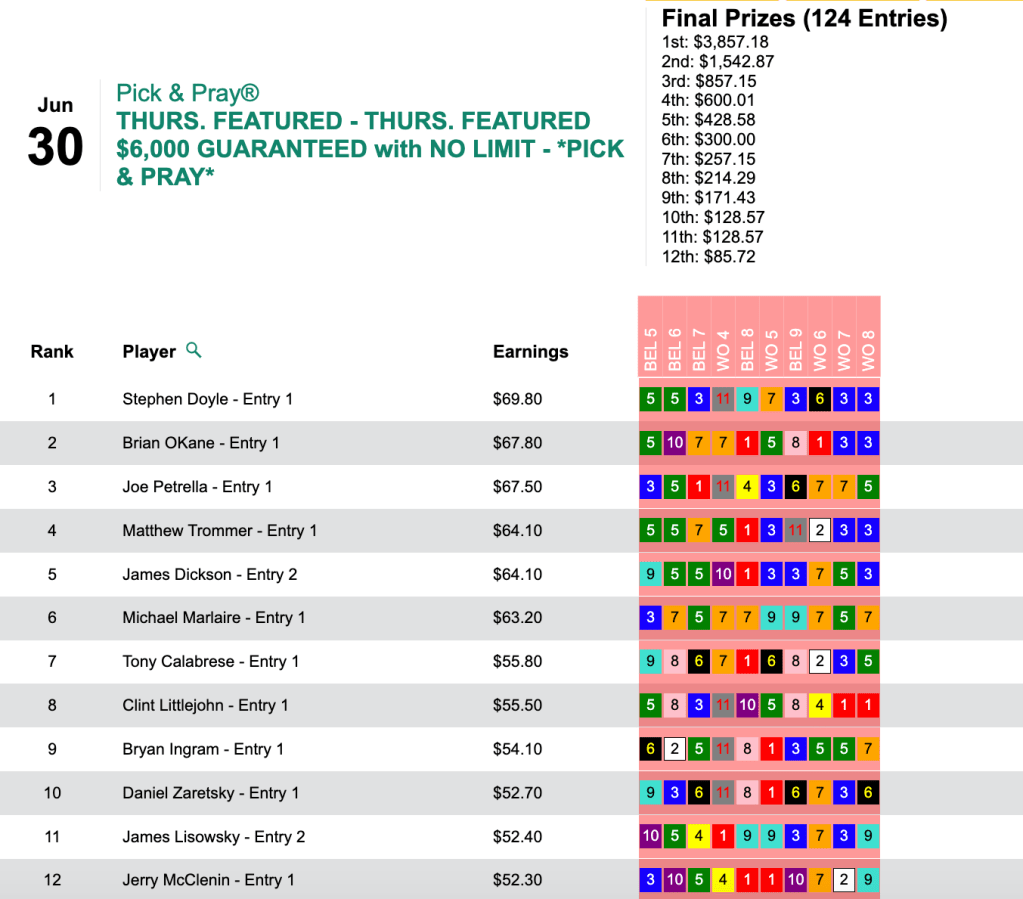 That Big Bucks game was contested in Live-format, but with the benefit of hindsight, we can see that Lydon played it like a Pick & Pray—because he used the same 12 selections to capture Sunday’s qualifier to The BIG One.