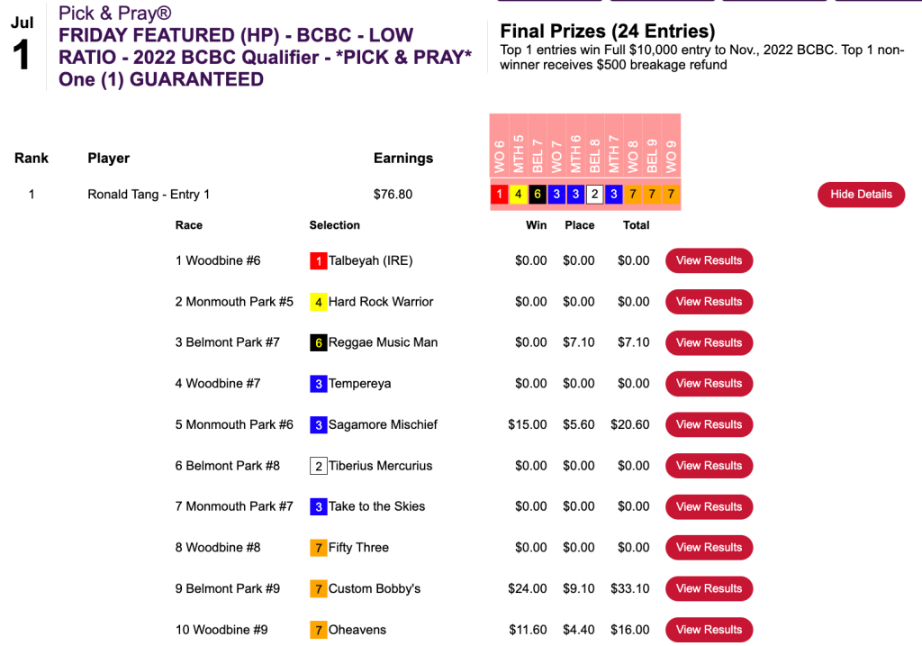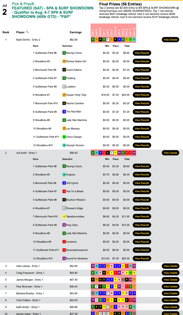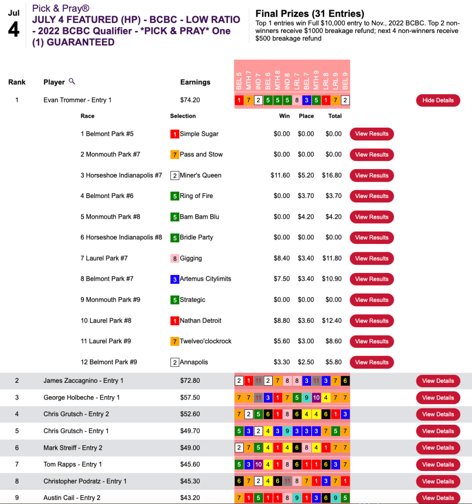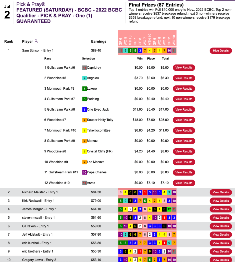 He blanked on the first five races, but made collections in four of the remaining five to garner a $2,500 seat to the final leg of the 2022 Tourney Triple in Thursday’s Pick & Pray qualifier.