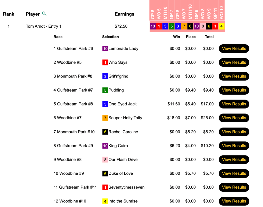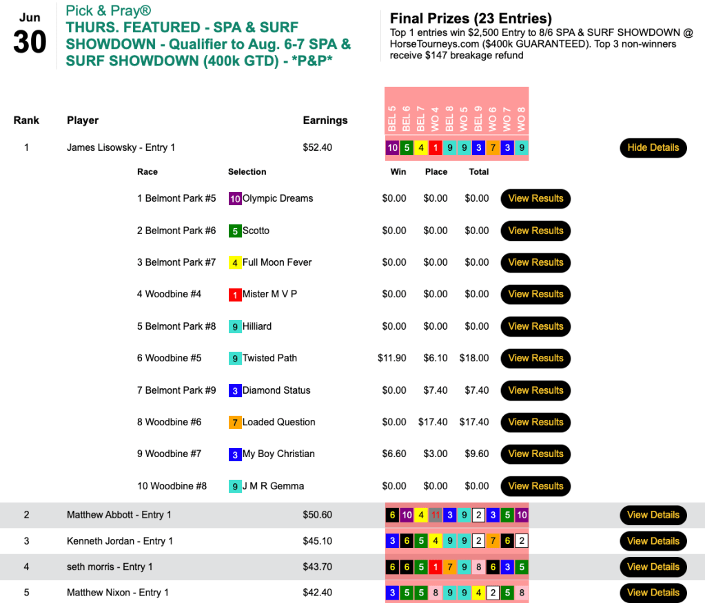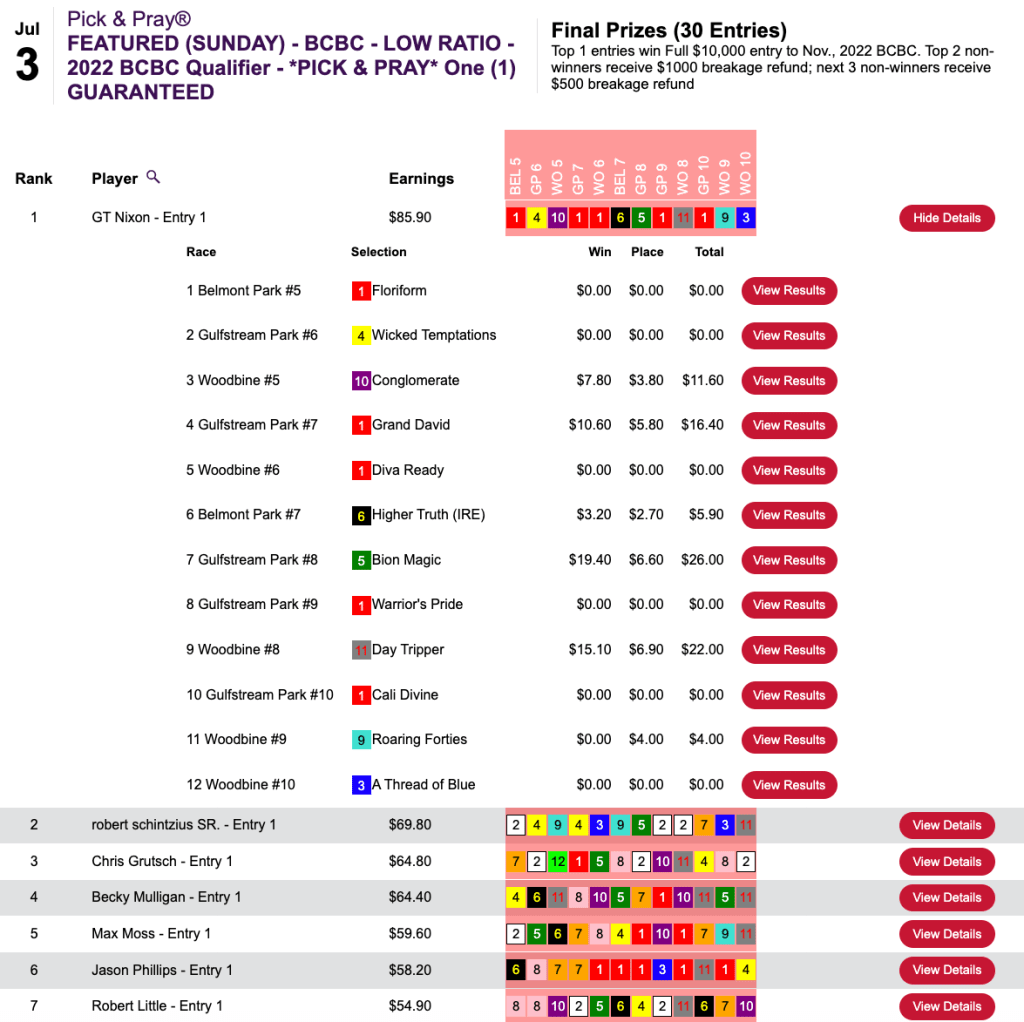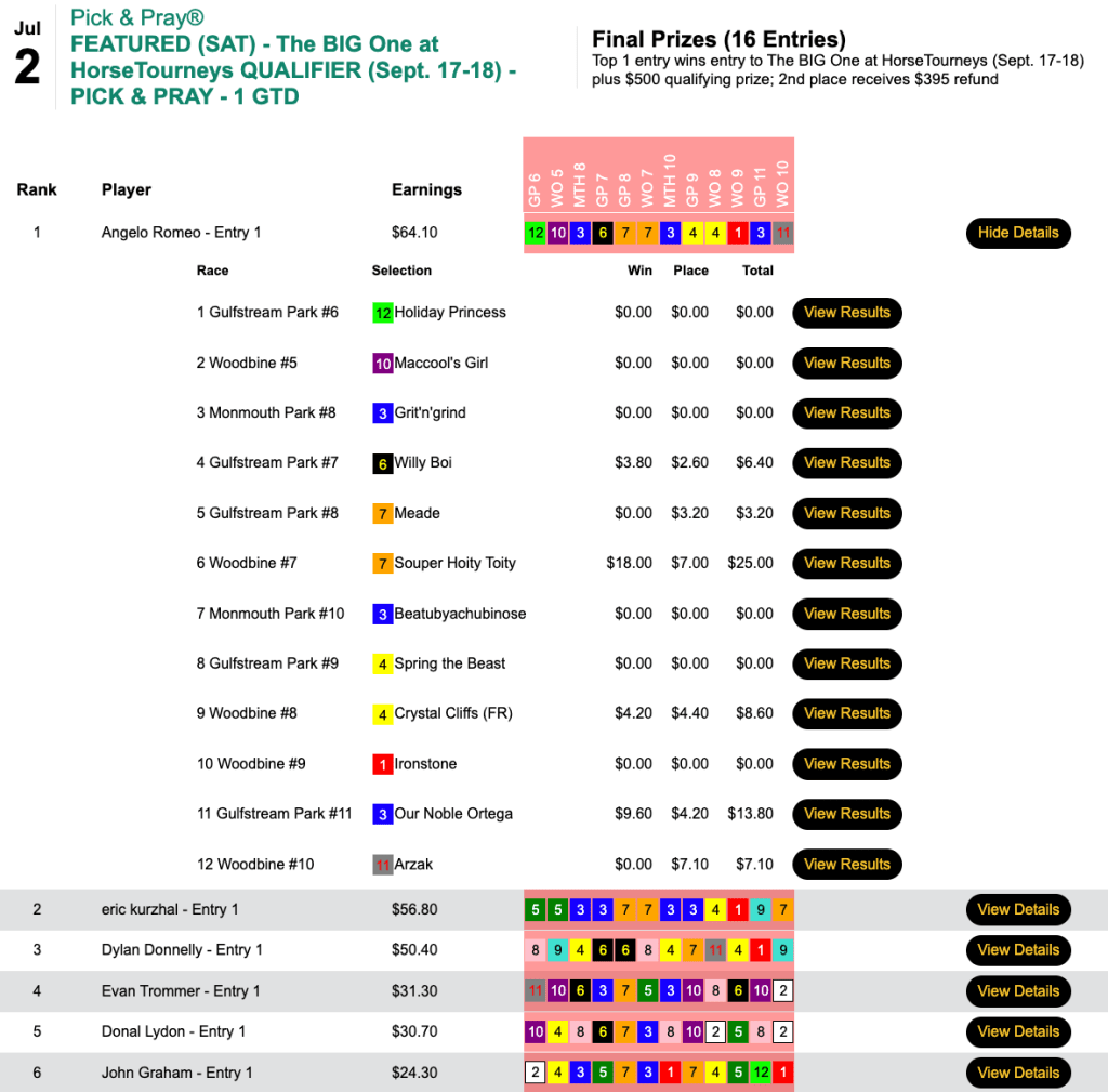 He blanked on the first five races, but made collections in four of the remaining five to garner a $2,500 seat to the final leg of the 2022 Tourney Triple in Thursday’s Pick & Pray qualifier.