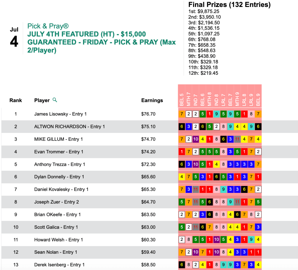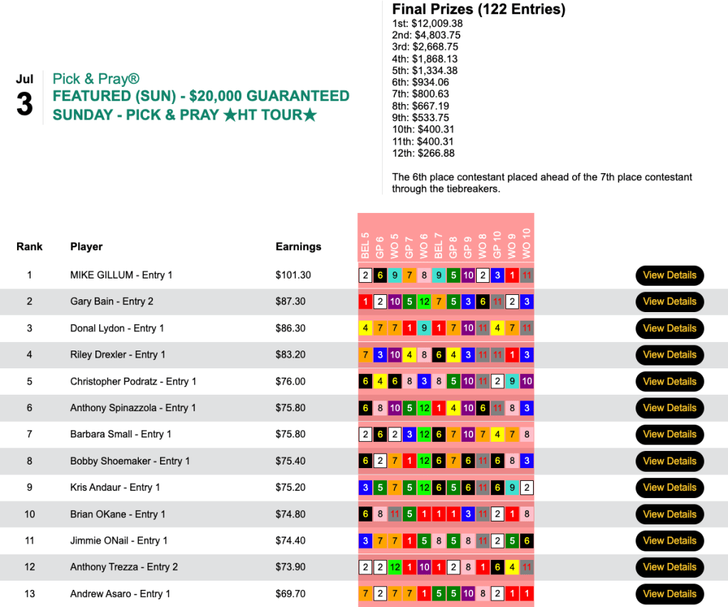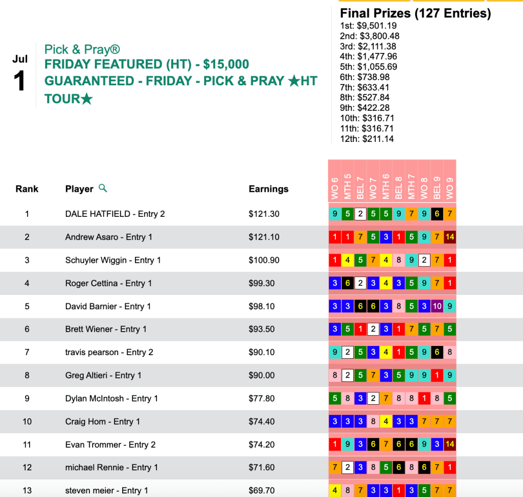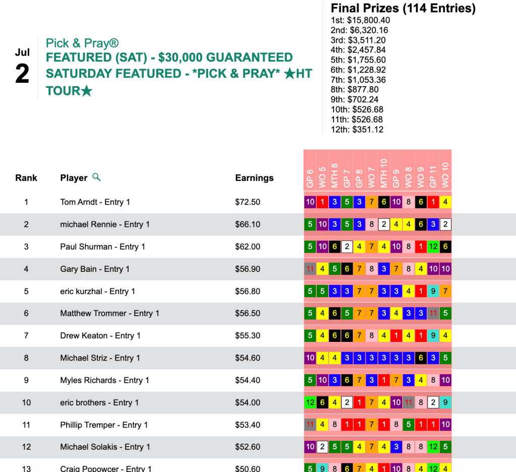 The richest tourney of the week was Saturday’s HT Tour event, our $30,000 Guaranteed Pick & Pray, which closed its doors with a final purse of $35,112.