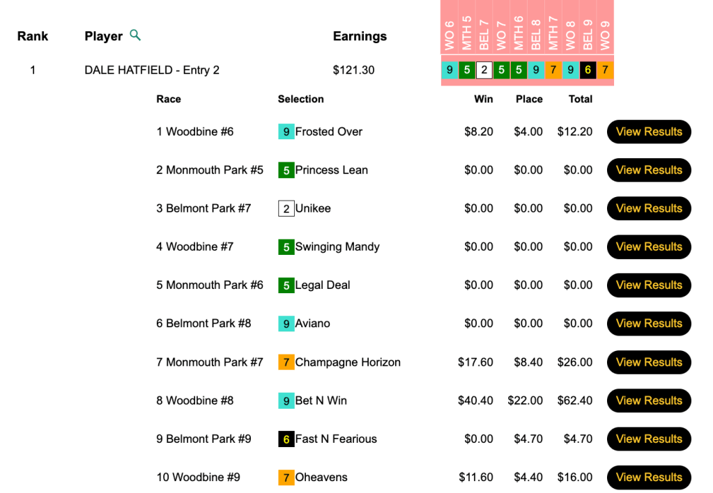 The two to walk off with 2023 seats to the big dance—Mike Coutu (4 wins, 2 places…all in first 8 races) and Dan Brockman (3W, 2P)—did so with final scores in the 60s. Coutu and Brockman both had Super Hoity Toity ($18.00, $7.00) in the 7th at Woodbine.
