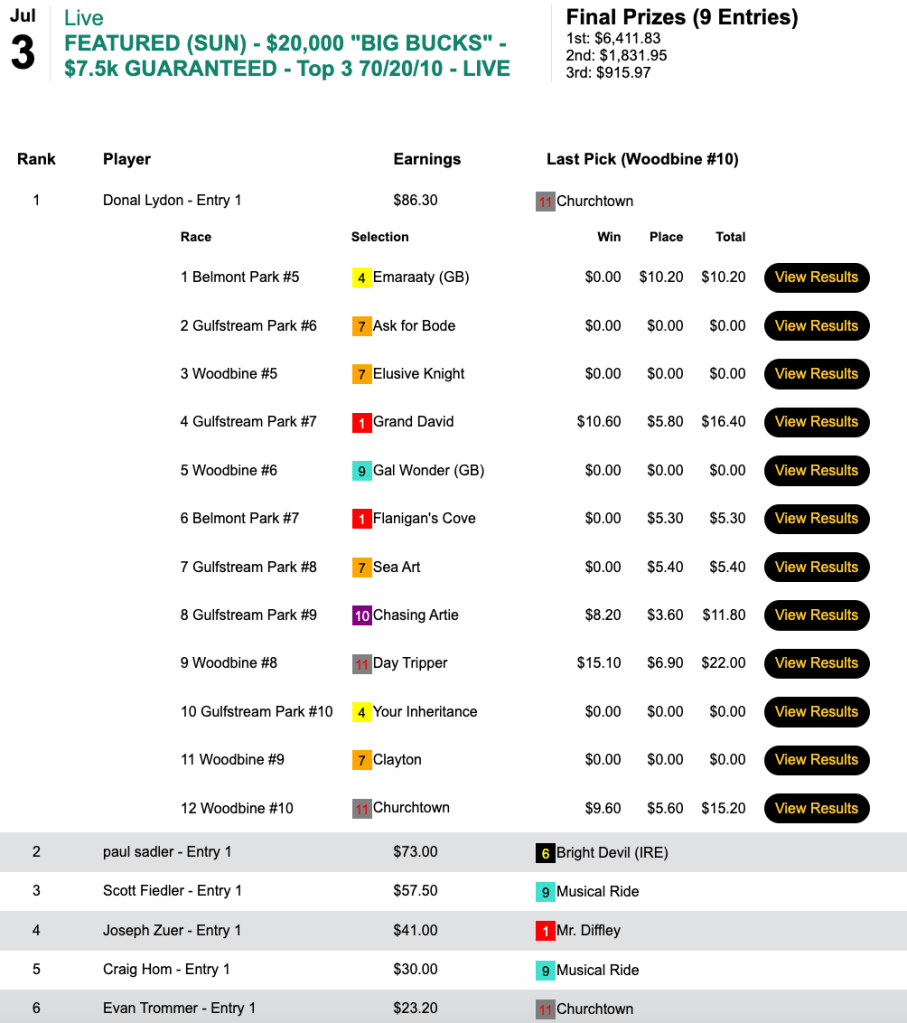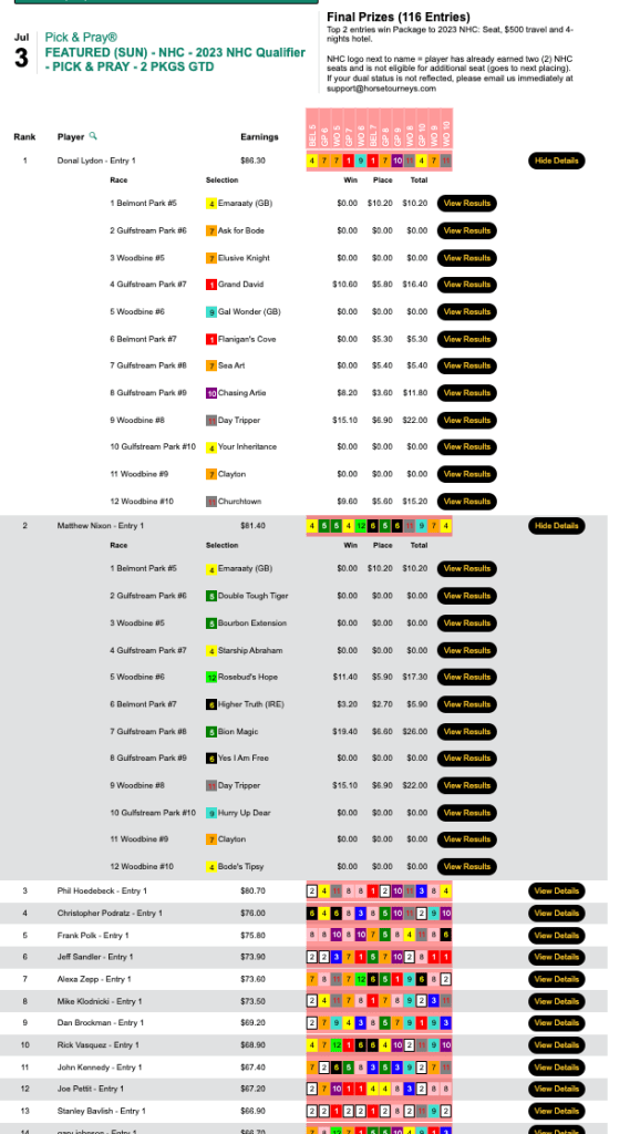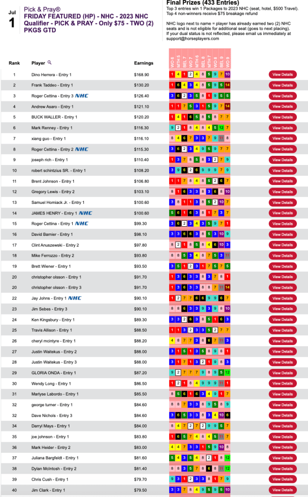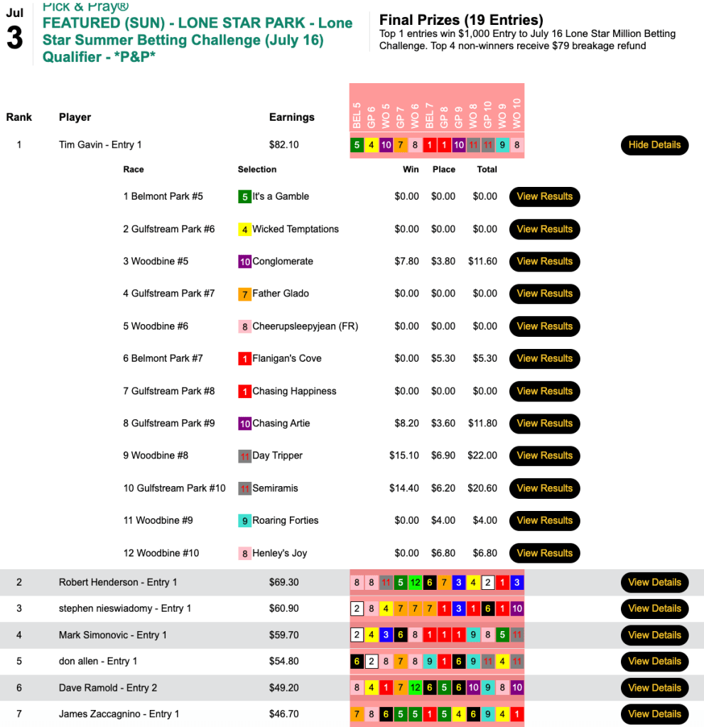 This was a special $100 qualifier guaranteeing 4 seats (Four on the Fourth, if you will). Tom Timlick checked in second with 5 wins and 2 places. Gary Bain ran third, but he was already double qualified and playing for NHC Tour points. So the remaining two seats went to Jim Lisowsky and Jimmie O’Nail who—similar to Lisowsky in the $21,000 game—got himself into the end zone thanks to having $6.00-to-place runner up Double Clutch in the final contest race, the 9th at Belmont.