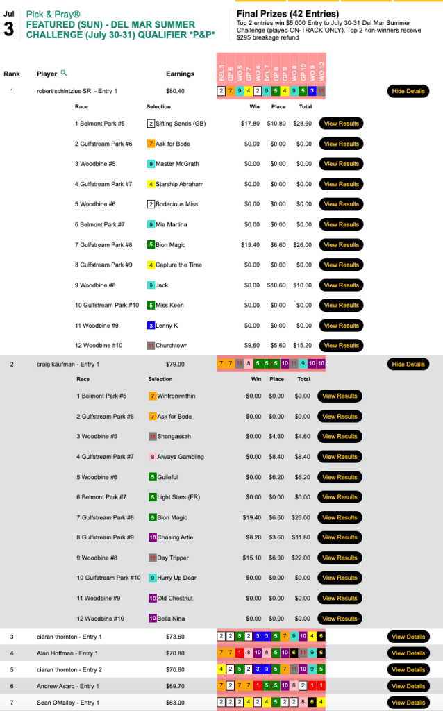 Schintzius booked 3 winners and 1 runner up. Kaufman recorded 3 runners up followed by 3 winners. They both received hefty $5,000 entries for the two-day contest at Del Mar on the last two days of July. Schintzius and Kaufman each came up with the day’s highest yielding winner, Bion Magic (19.40, $6.60) in the 8th at Gulfstream.