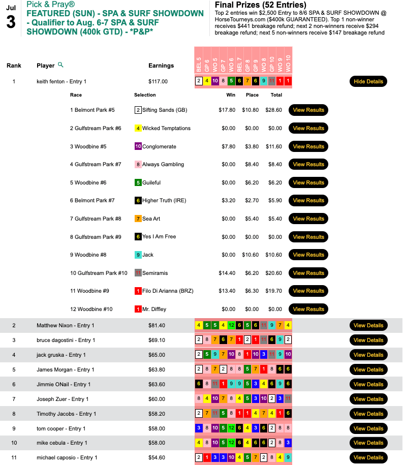 Fenton’s score of $117.00 was the best put up on Sunday—and he did it despite not having the day’s biggest win price (the $19.40 returned by Bion Magic in the 8th at Gulfstream). However, Fenton had the other three double-digit winners out there to lay claim to the top spot and the $2,500 Spa & Surf seat that went with it.
