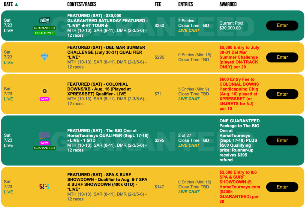 Live-format qualifiers to The BIG One ($395 entry fee, 1 seat guaranteed), the $400,000 Guaranteed Spa & Surf Showdown ($147, 1-per-20 winning ratio); the Del Mar Summer Challenge ($295, 1-per-20); and the Colonial Downs Handicapping Challenge ($71, 1-per-10) are also part of the Sunday featured-tourney slate at HorseTourneys.